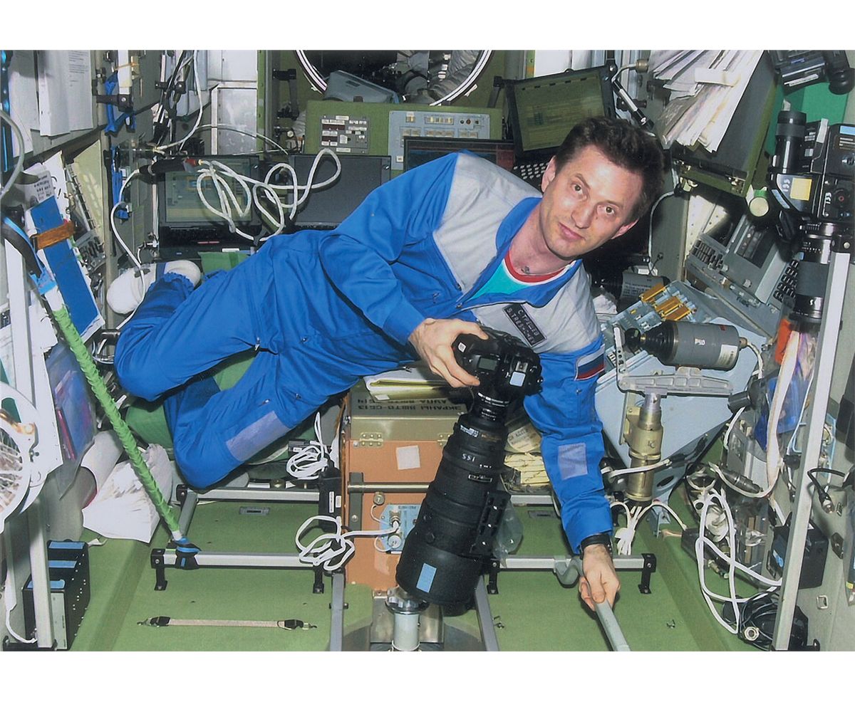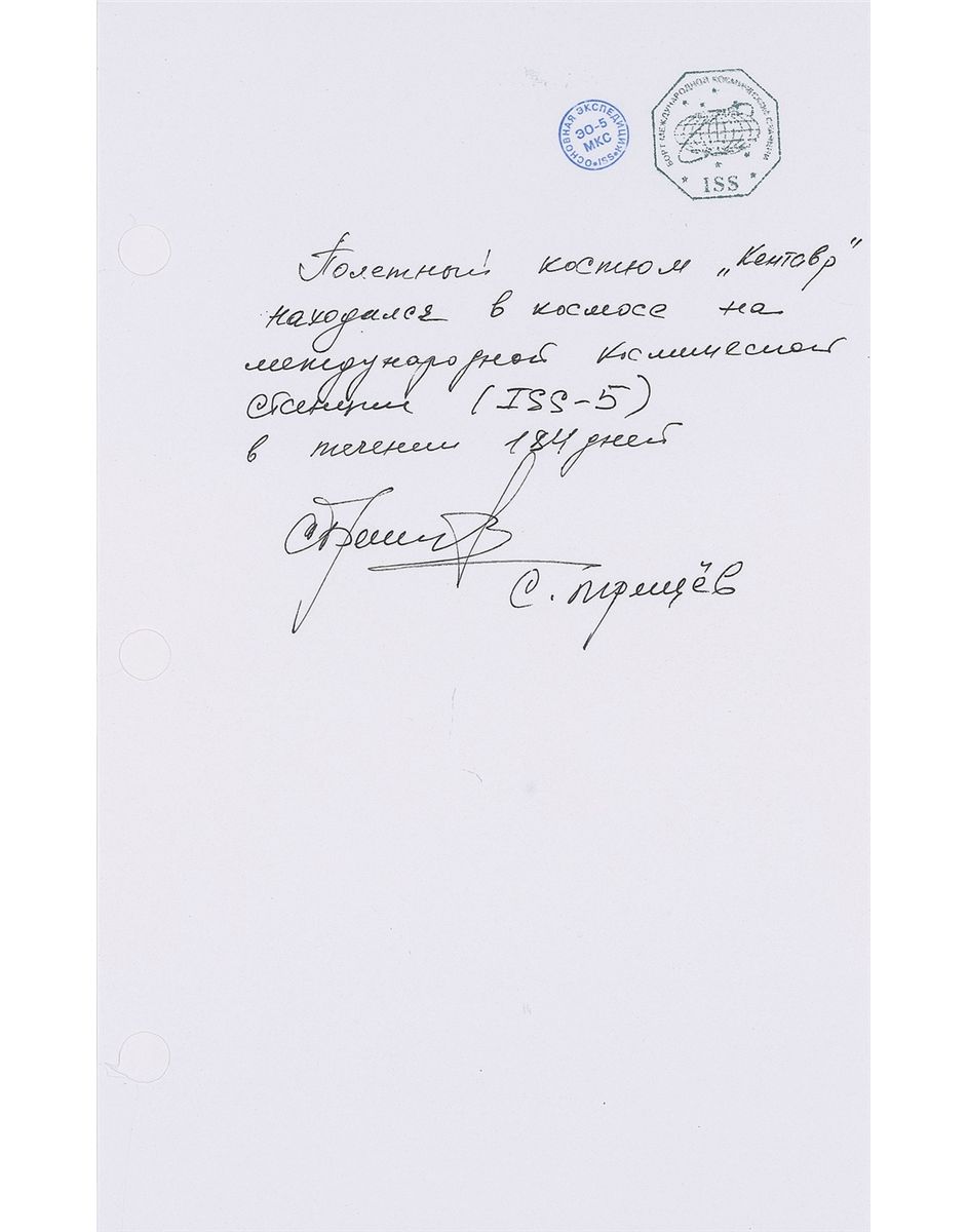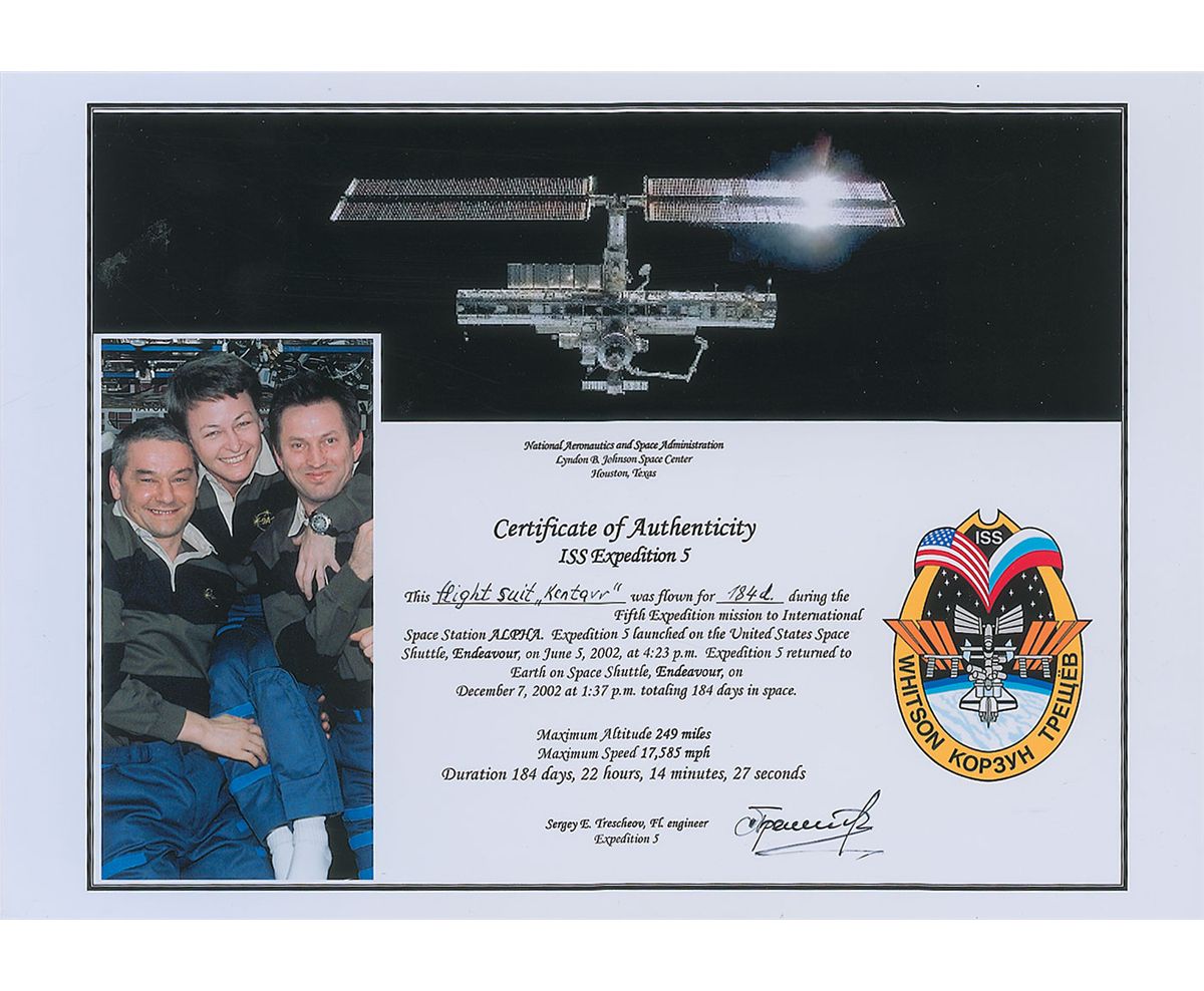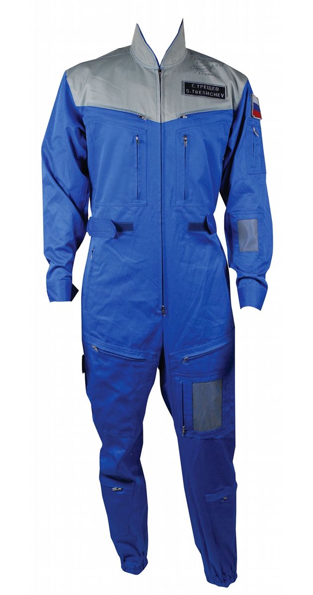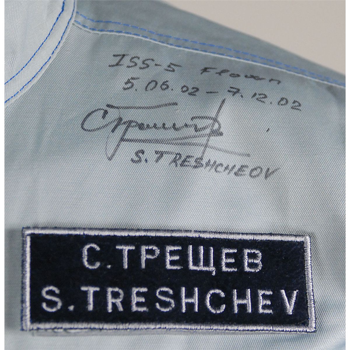 Cosmonaut Sergei Treshchev’s flown and worn flight suit carried on board the International Space Station from June to December of 2002. One-piece blue and gray flight suit features zip-up and Velcro pockets, a Russian Federation flag on one shoulder, and an embroidered name tag in English and Cyrillic affixed with Velcro to the left breast. Suit is signed in the upper left, “ISS-5 Flown, 5.06.02-7.12.02, S. Treshcheov.” Suit comes with its original storage bag. In fine condition. Accompanied by a letter of provenance from Treshchev, a photo of Treshchev wearing the suit in orbit, and a certificate of authenticity which reads, in part: “This flight suit ‘Kentavr’ was flown 184 d. during the Fifth Expedition mission to the International Space Station Alpha.” Such well-documented flown garments are quite uncommon.