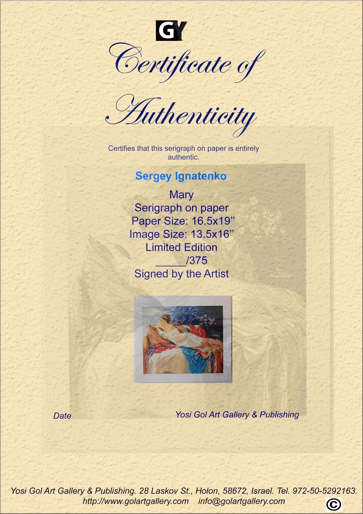Artist: Sergey Ignatenko. Medium: Original Serigraph on Paper. Title: Mary. Size (Unframed): 22.5" x 19". Limited Edition: Edition of 375. Certificate of Authenticity: From the publisher.