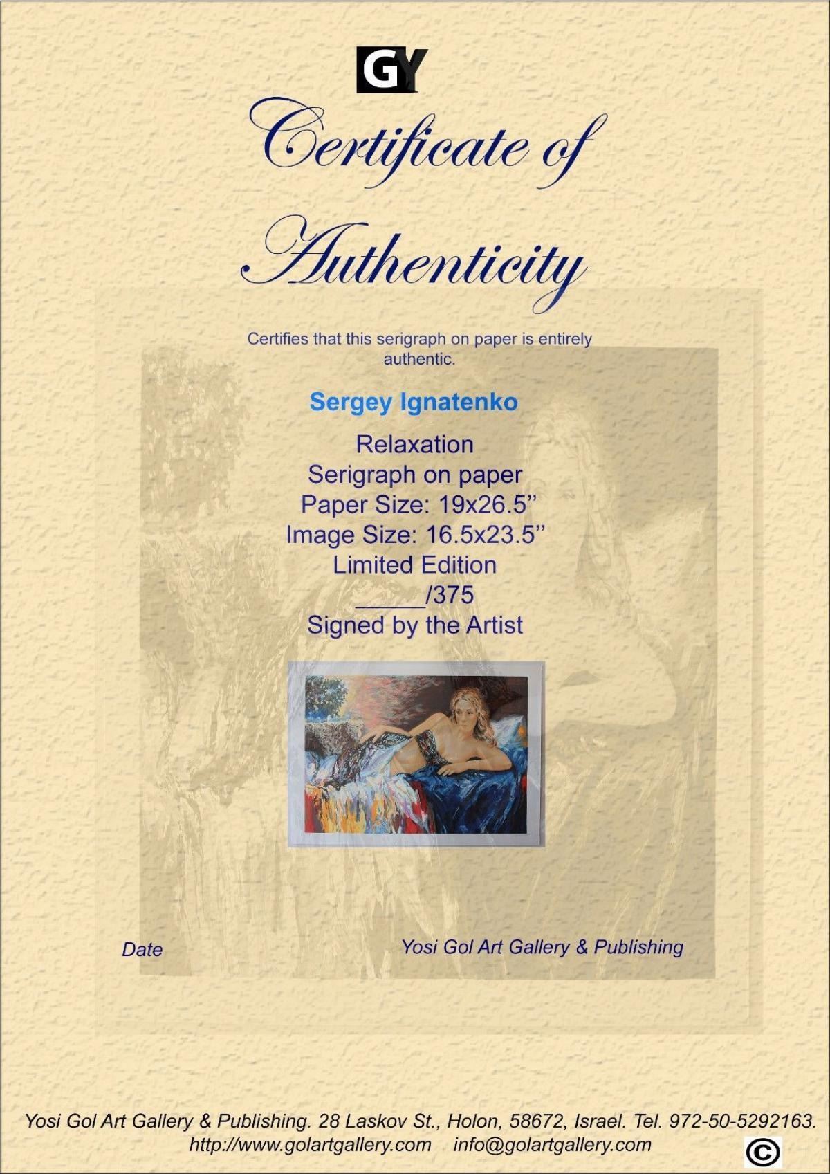 Artist: Sergey Ignatenko. Medium: Set of 5 Serigraph on Paper. Title: Long Day, Thinking of you, Relaxation, Sleeping Beauty, Mary. Limited Edition: Edition of 375. Certificate of Authenticity: From the publisher. Additional: Please see certificates for sizes on each work..