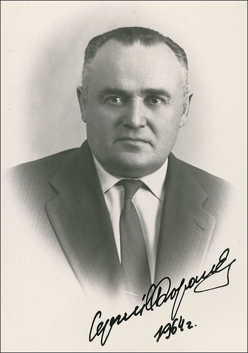 Rare matte-finish 3.5 x 5 photo, boldly signed in black ink, "Sergey Korolyov, 1964." In fine condition.