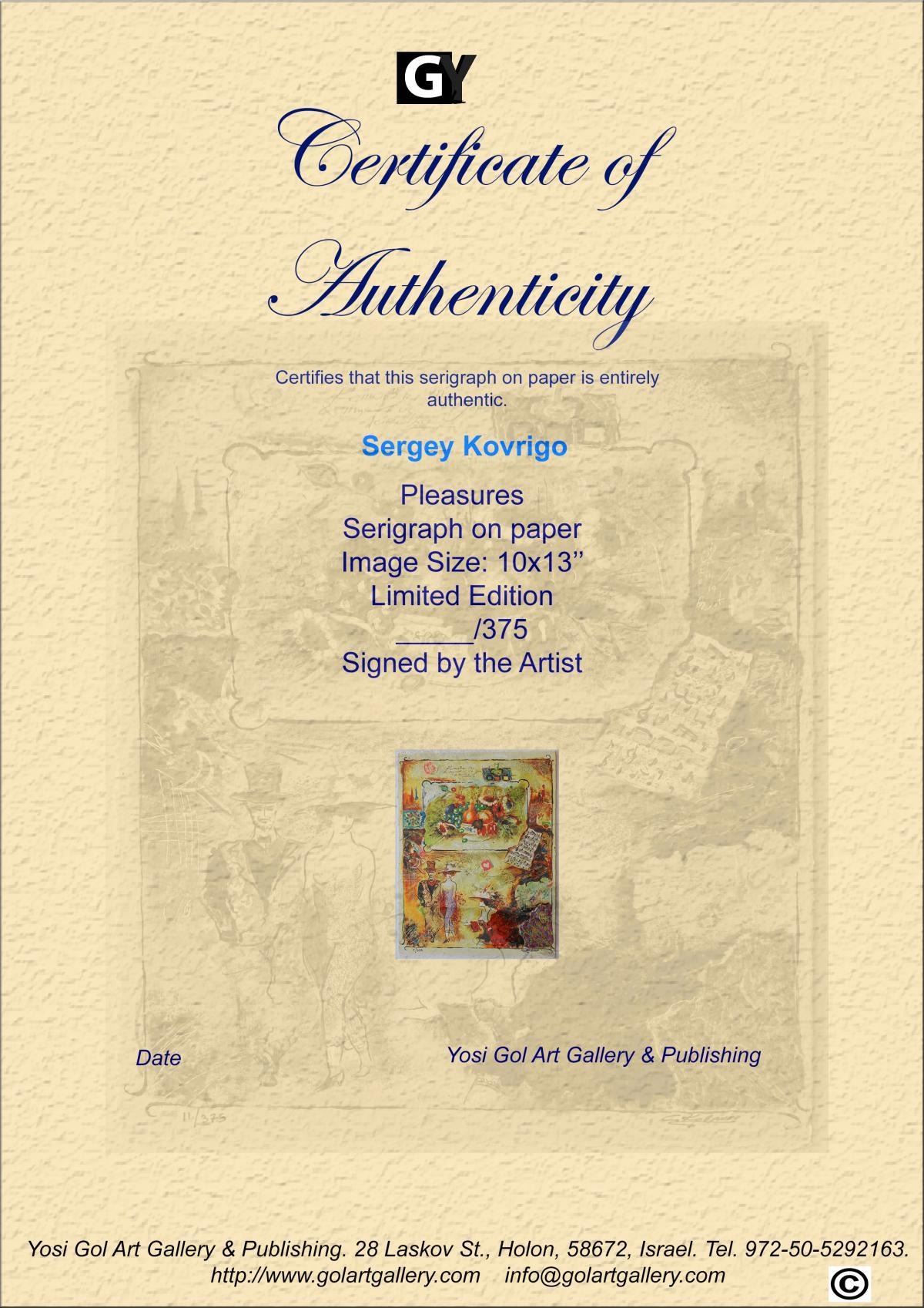 Artist: Sergey Kovrigo. Medium: Original Serigraph on Paper. Title: Pleasures. Size (Unframed): 13" x 10". Limited Edition: Edition of 375. Certificate of Authenticity: From the publisher.
