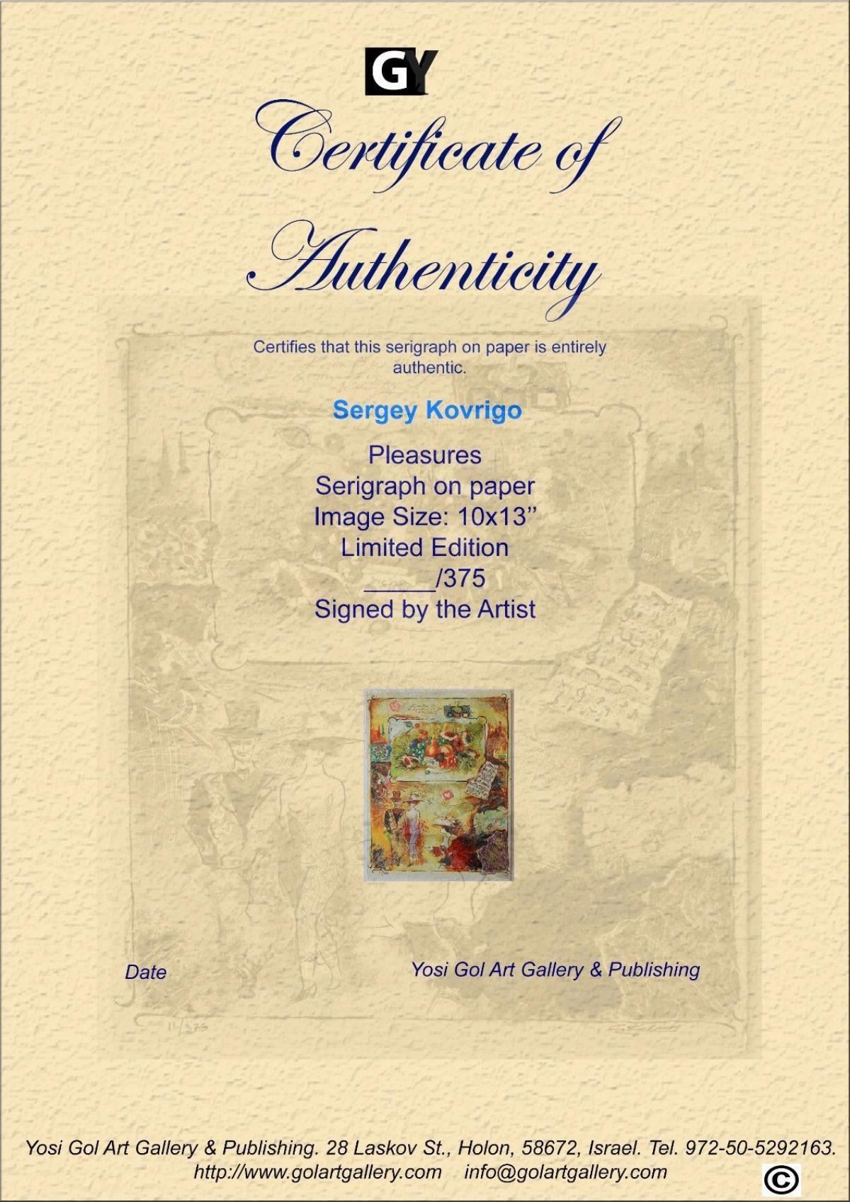Artist: Sergey Kovrigo. Medium: Set of 6 Serigraph on Paper. Title: Rendezvous, Friendship, Pleasures, Red Bouquet, Wine and Roses, Sunshine Roses. Additional: Please see certificates for sizes on each work..