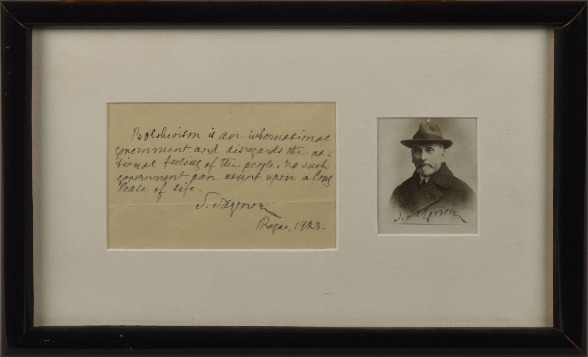 Russian statesman (1860–1927) who was involved in negotiating the Potsdam Agreement and the Russo-Japanese Defensive Alliance, and was involved in events leading up to WWI. Two items: an AQS signed "S. Sazonov, Prague 1923, in full: "Bolshevism is an international government and disregards the national feeling of the people. No such government can count upon a long lease of life"; and a matte-finish 2.25 x 2.75 portrait, signed "S. Sazonov." Matted and framed together to an overall size of 13.5 x 8.5. In overall fine condition, with a paperclip impression to the top edge of the photo.