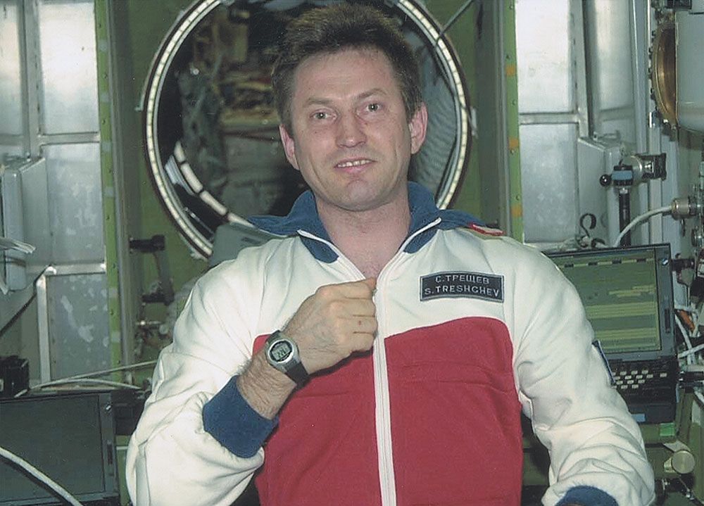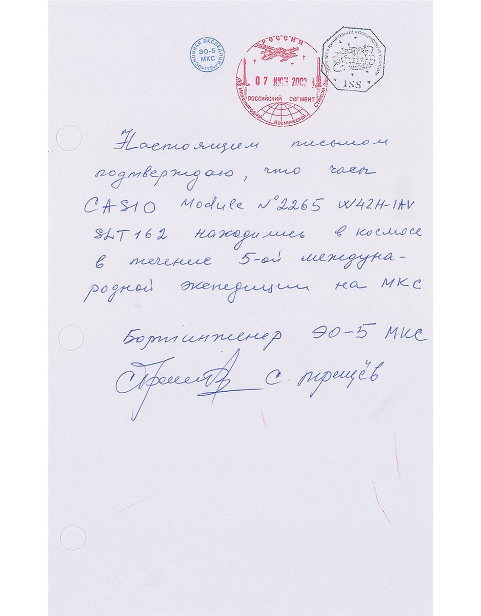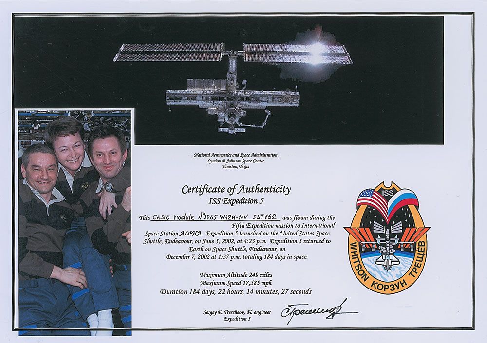 Flown watch worn on board the International Space Station Expedition 5 by cosmonaut Sergey Treshchev. Digital Casio module 2265, model W42H has a black resin band with lighted display. The Expedition 5 crew launched on the space shuttle Endeavour on June 5, 2002, and returned to Earth on the Endeavour on December 7, 2002, with the crew spending 184 days in space. Accompanied by a certificate of authenticity signed by Treshchev, as well as a handwritten letter from the cosmonaut, in Russian, confirming that this was the watch he wore during his mission, and bears the official stamps of the ISS. Also included is a photo of Treshchev wearing the watch while on board the space station. In fine condition. Any timepiece that has flown to space is highly desirable, especially one with such outstanding documentation.