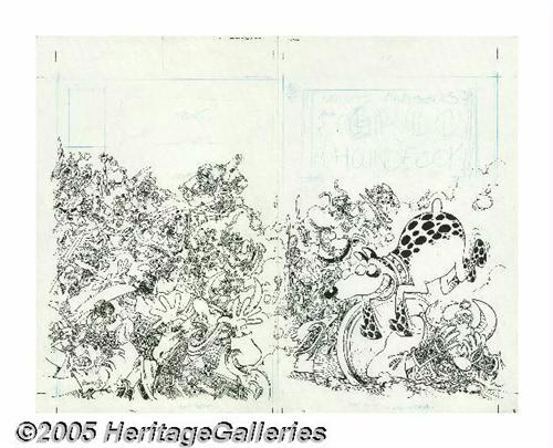 <B>Sergio Aragones - Groo: Houndbook Wraparound Cover Original Art (Dark Horse, 1999).</B></I> Rufferto and Groo cut a swath through a horde of barbarians on this lighthearted masterwork by that legendary Mad-man, Sergio Aragones. The panoramic detail of this scene is both mind-boggling and rib-tickling. The image area of the wraparound cover is 21" x 15". The image was made on one sheet of paper that was then scored and folded in half; otherwise the art is in Excellent condition.
