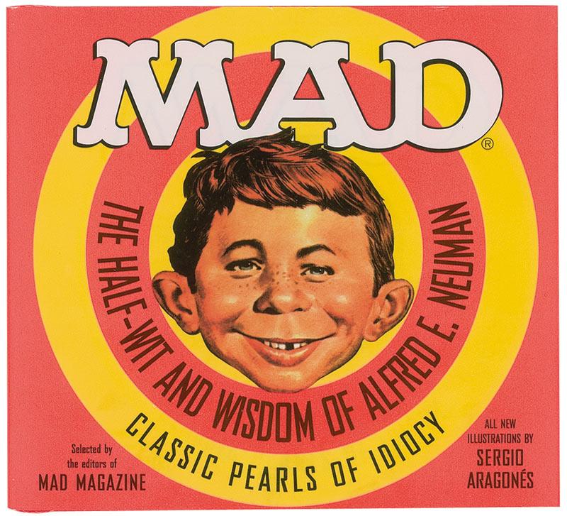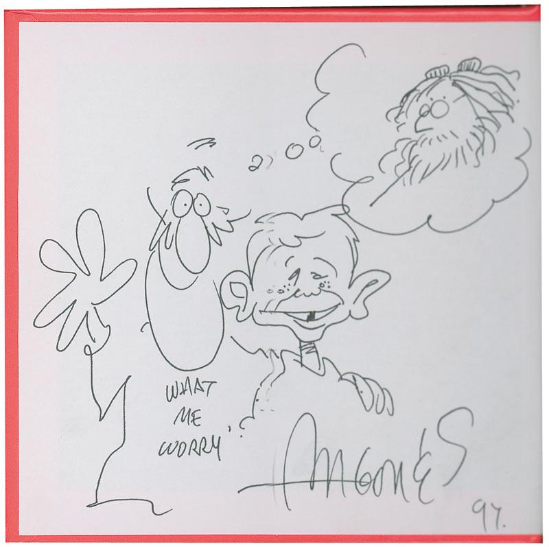 Signed book: Mad: The Half-Wit and Wisdom of Alfred E. Neuman. First edition, first printing. NY: Warner Books, 1997. Hardcover with dustjacket, 5.75 x 5.25, 85 pages. Signed on the inside front cover “Aragones ´97,” adding a great self-portrait of himself posing with Alfred E. Neuman. In fine condition.