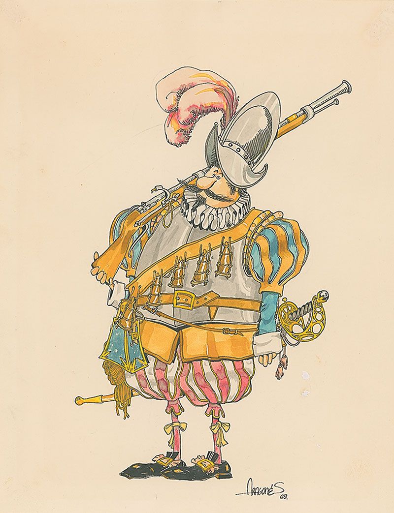 Original signed ink and watercolor artwork of an absurd looking musketeer on an off-white 9.75 x 12.5 sheet, signed in the lower right in black ink, “Aragones, 69” In fine condition.