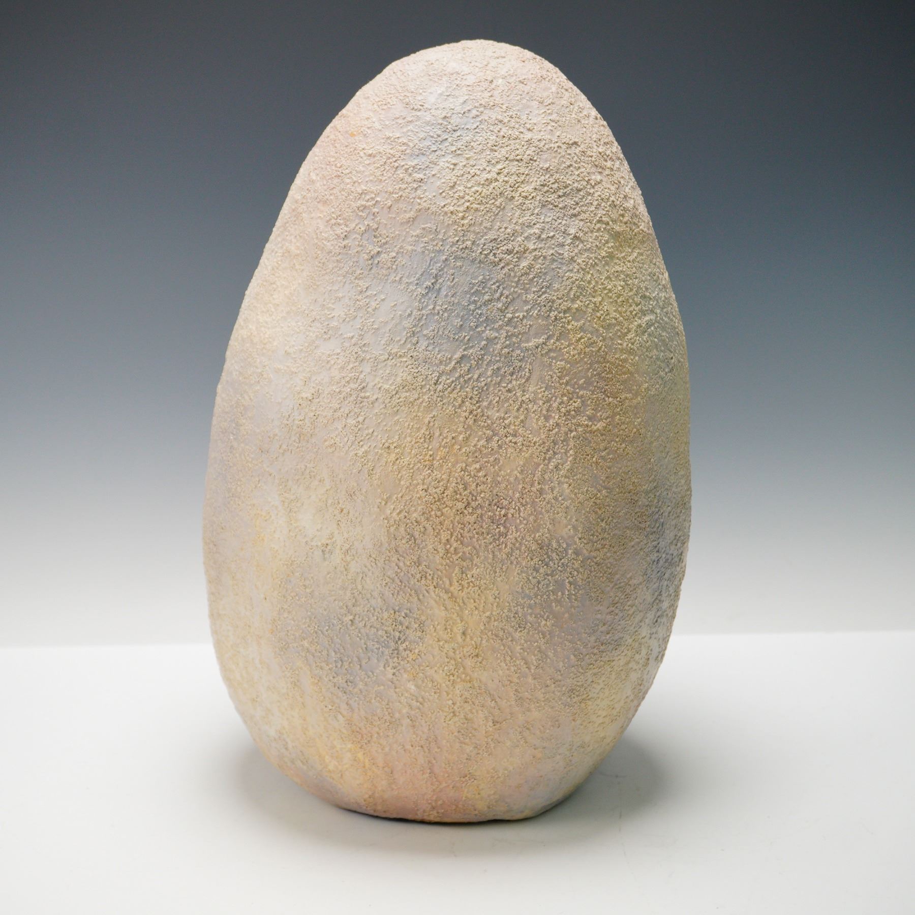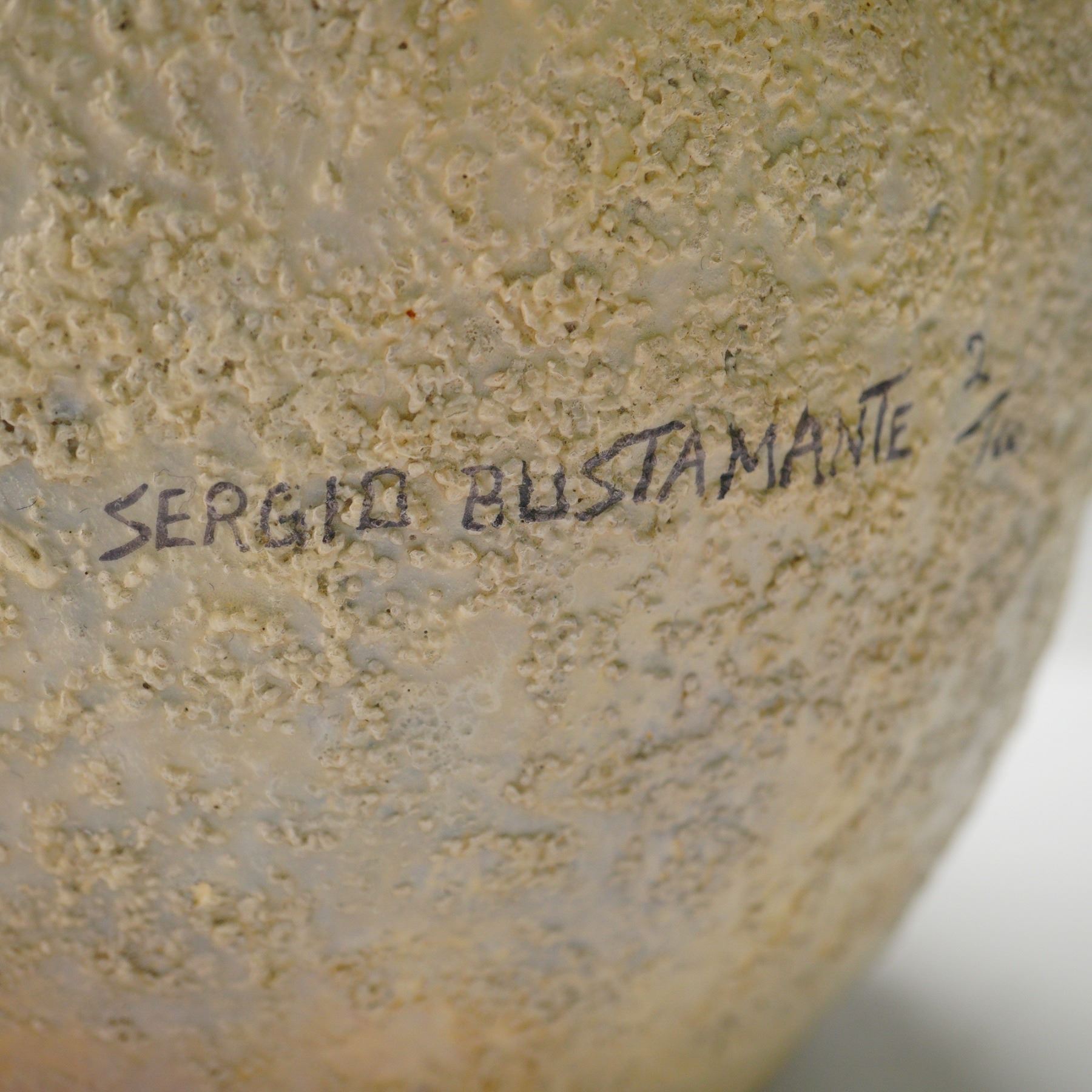 This remarkable work by celebrated Mexican artist Sergio Bustamante exemplifies his signature blend of surrealism, whimsy, and fine craftsmanship. The sculpture takes the form of an egg-shaped vessel, textured with a subtly variegated surface in soft natural tones. Emerging from the front is a delicately modeled face, serene and dreamlike, rendered with smooth precision that contrasts beautifully with the rough, organic exterior. The piece embodies Bustamante's fascination with metamorphosis and fantasy, themes that recur throughout his prolific career in sculpture, painting, and design. Signed Sergio Bustamante on the lower side and numbered 2/100, this work is part of a rare limited edition. Bustamante's creations, often playful yet deeply symbolic, have earned him international acclaim and a devoted collector base. This sculpture not only highlights his unique vision but also represents his mastery of form and texture, transforming a simple egg-like shape into an enigmatic object of wonder. A highly collectible piece that will appeal to admirers of modern Mexican art and surrealist-inspired design.