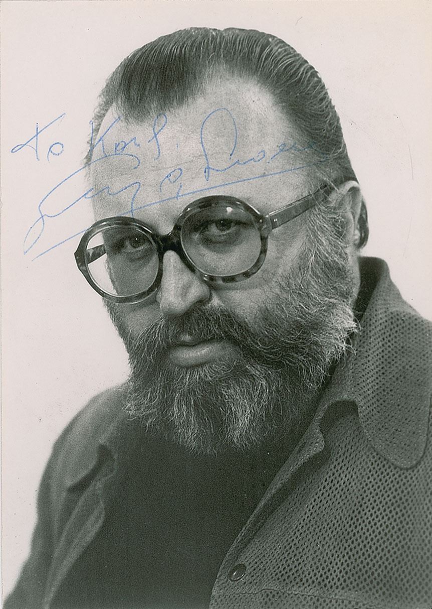 Semi-glossy 4 x 5.75 photo of the Italian director wearing his trademark large glasses, signed and inscribed in blue ballpoint, "To Karl, Sergio Leone.” In fine condition.