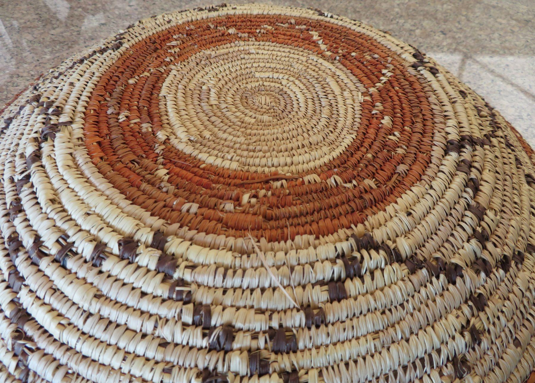 Seri Polychrome Basket, c. 1960s. Made of all-natural desert materials, the item measures 14" wide. Seri, Colorado River. Very eye-catching design with brown/orange, white and black. Condition: Good, see images. Shipping: $20.00 w/insurance and signature, due to size.