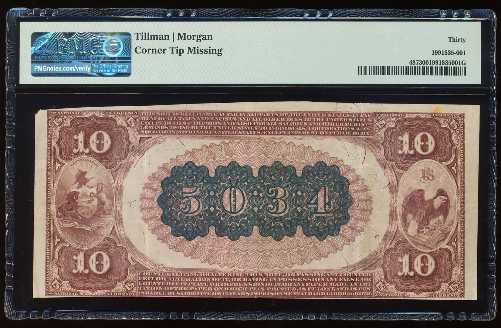Serial # 1 - 1882BB $10 Second NB of Uniontown, PA CH# 5034 National Note PMG VF30