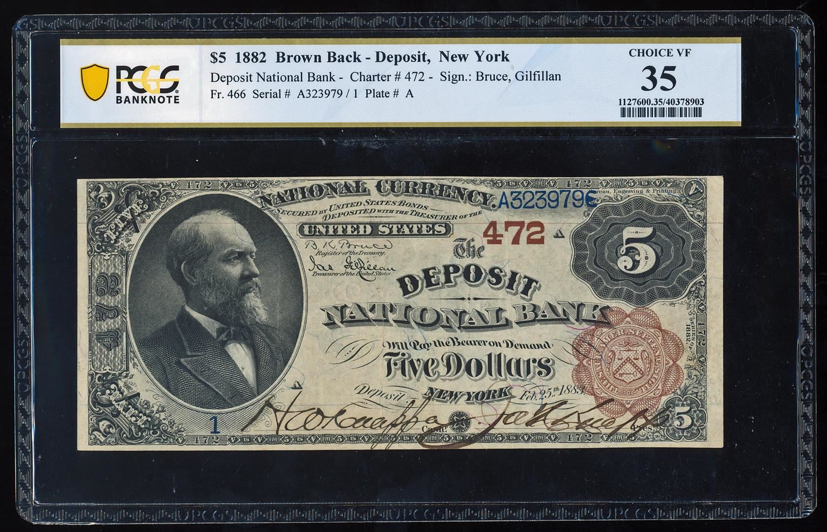Serial # 1 - 1882BB $5 Deposit, NY CH# 472 National Note PCGS Choice Very Fine 35