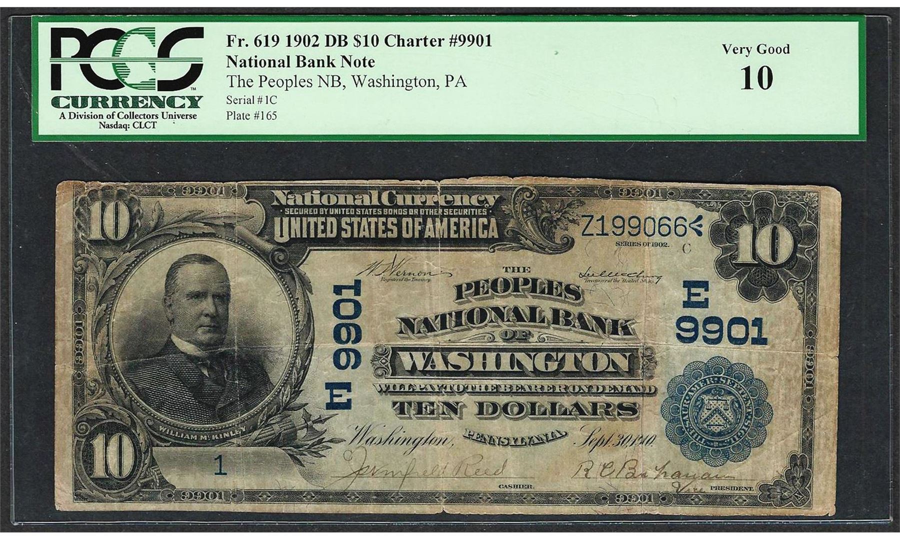 One Serial # 1 1902 DB $10 Washington, PA CH# 9901 National Currency Note PCGS Very Good 10. PCGS Graded.