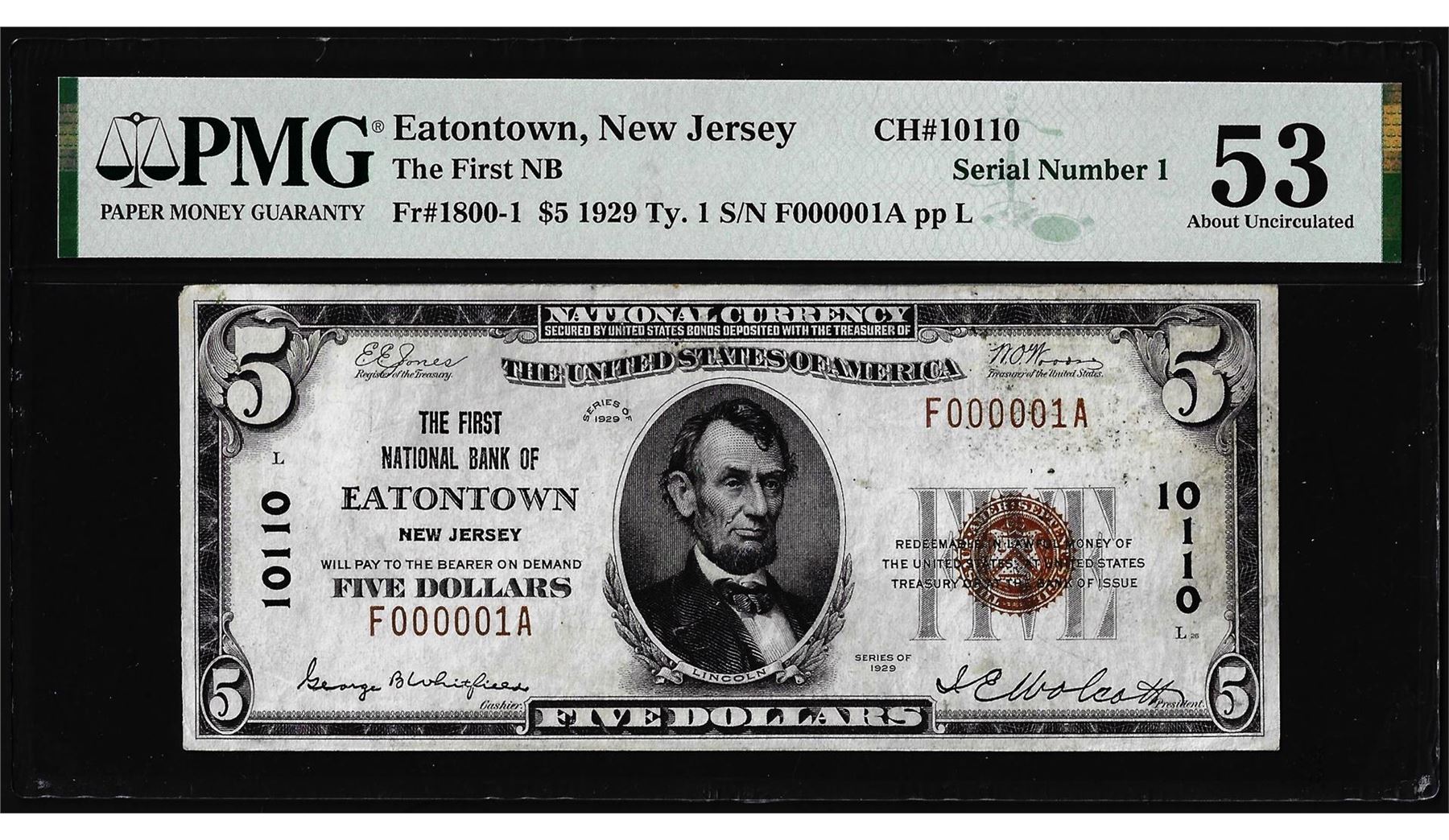 Serial #1 - 1929 $5 Eatontown, NJ CH# 10110 National Note PMG About Uncirculated 53