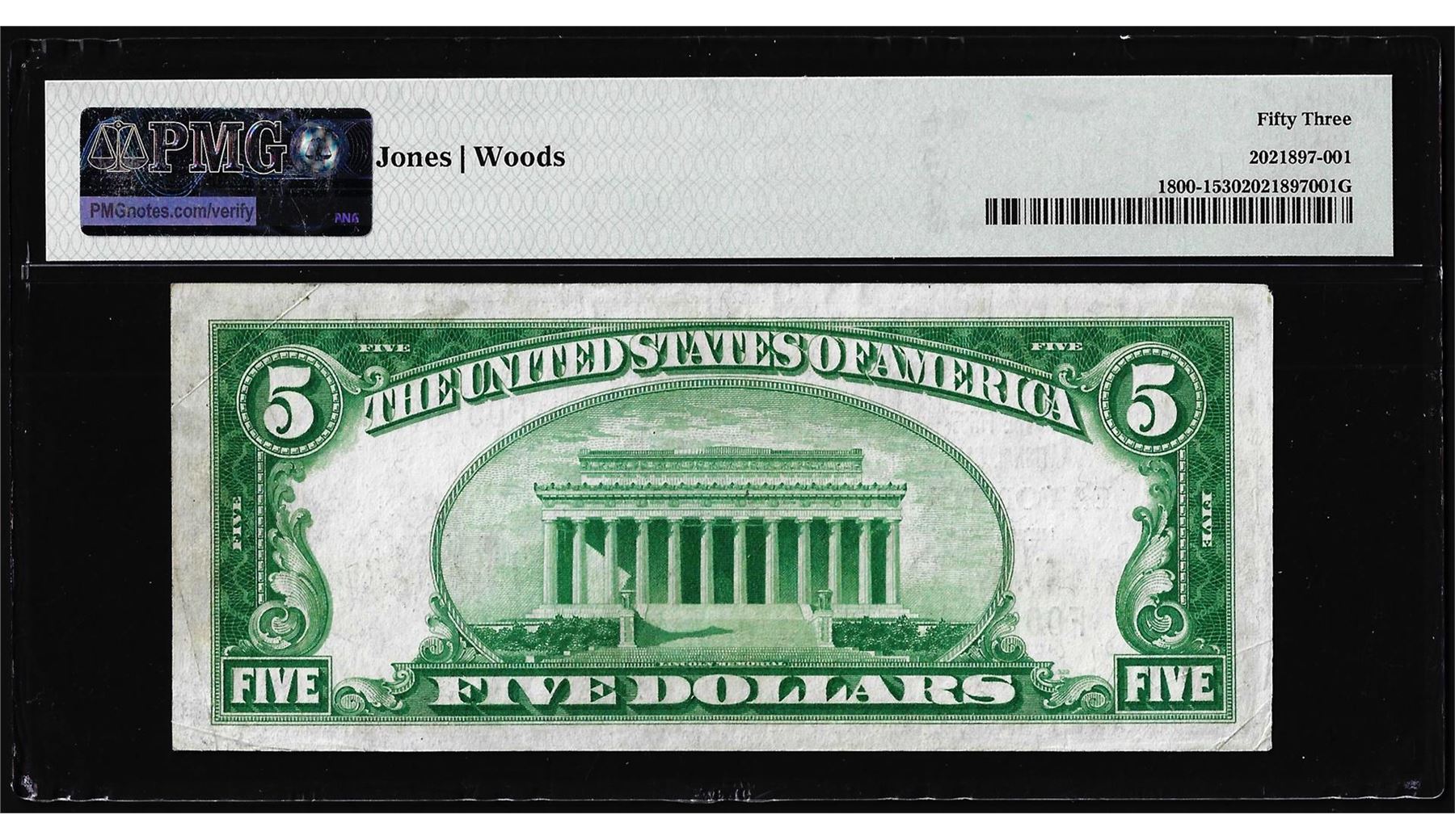 One Serial #1 - 1929 $5 Eatontown, NJ CH# 10110 National Note PMG About Uncirculated 53. PMG Certified.