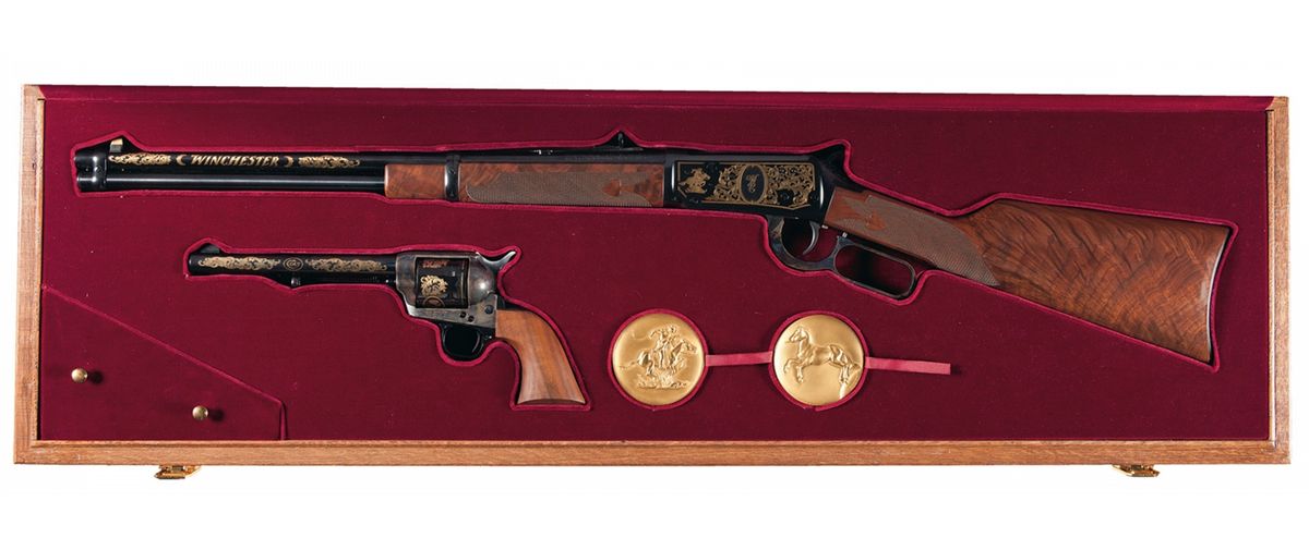 A) This is the very first production Colt/Winchester commemorative lever action carbine. The barrel has wonderful gold highlighted floral scroll with "WINCHESTER" on the left side of the barrel with the factory pictured on the right side. The receiver has the logo, floral scroll and "W/C" highlighted in gold on the left side with Oliver F. Winchester depicted on the right side with floral scroll highlighted in gold. The carbine is finished blue with a casehardened lever. Brass blade front and adjustable buckhorn rear sight, and mounted with a nicely figured checkered walnut forearm and straight grip stock with a smooth curved steel buttplate. Complete with an oak presentation case which also houses "B" of this lot, a brass commemorative plaque on the lid, wine colored velvet lining and two commemorative medallions, both are numbered "0001WC" on the back sides.