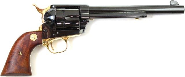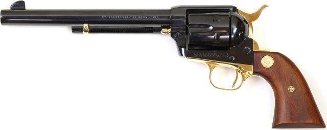 45 cal. revolver presented to Robert McBride VP Colt Marketing 1963. Features 7 1/2" barrel, blue finish with gold highlights and walnut medallion grips. Remains in 99% condition, unfired. Includes original 2 piece stagecoach box, cleaning brush, manual and its outer sleeve. Straight from the family, consigned by Robert McBrides daughter, confirmed by Colt factory letter, included. Interesting to note Colt archives show SN 1 being presented to Colt President with SN 2 going to VP of marketing. Modern. Est. 3500-4500