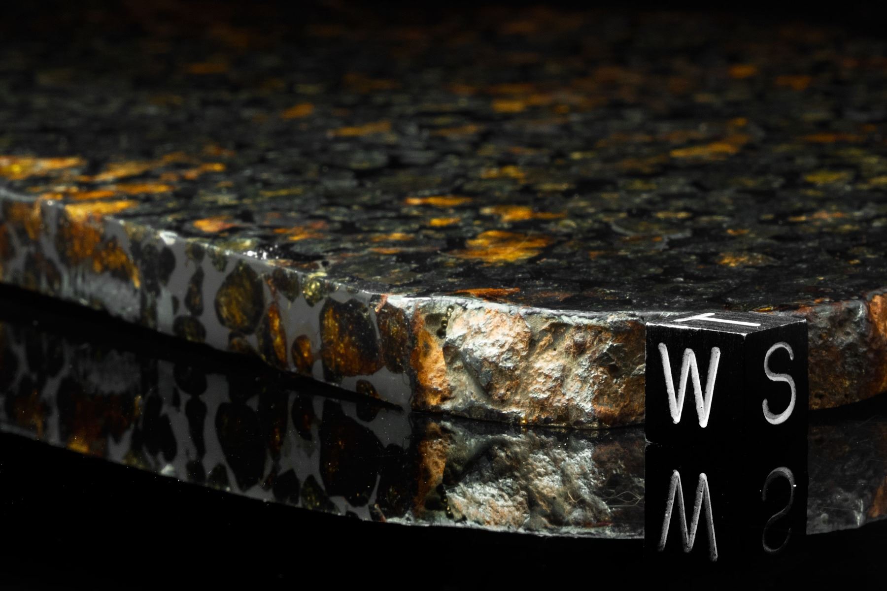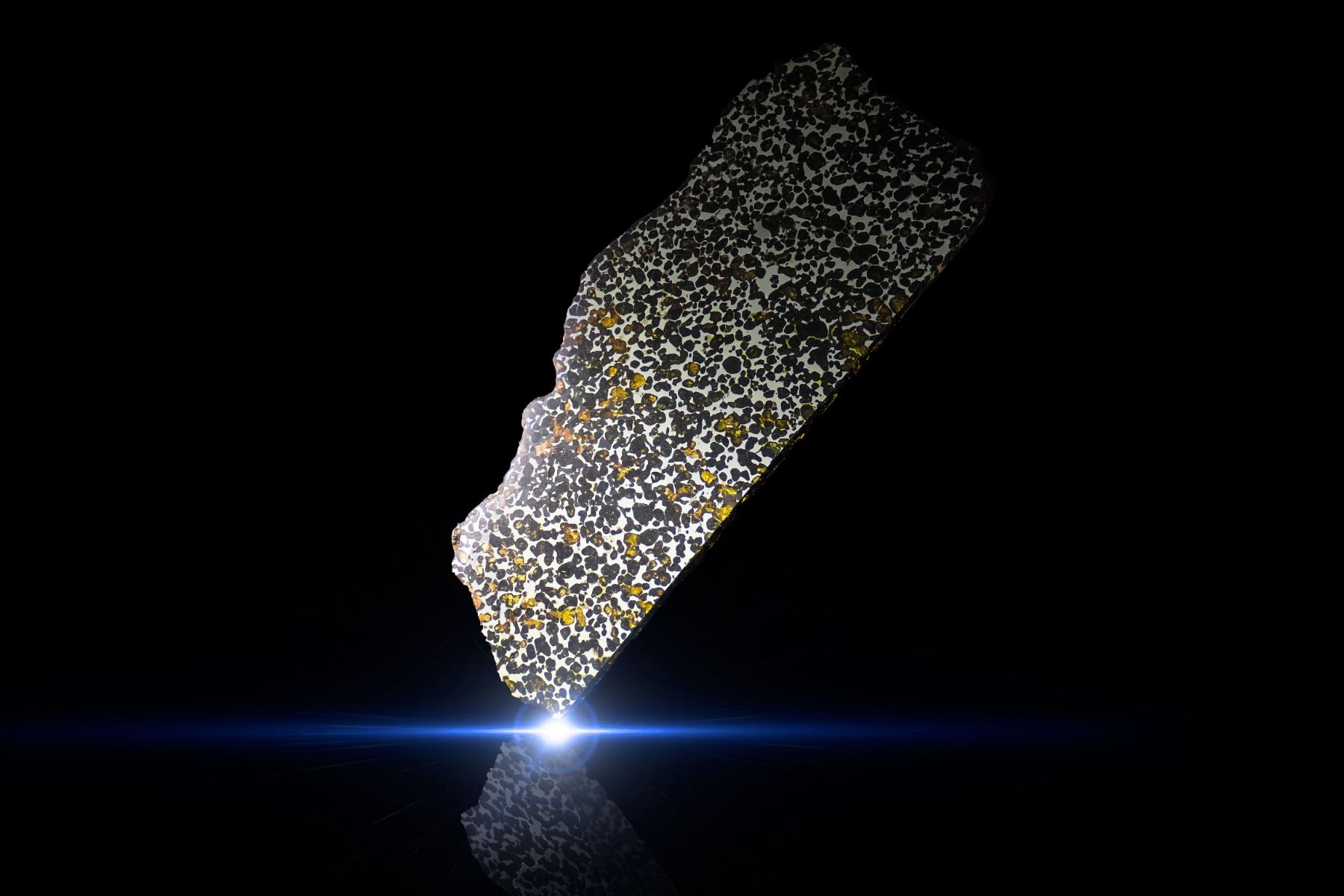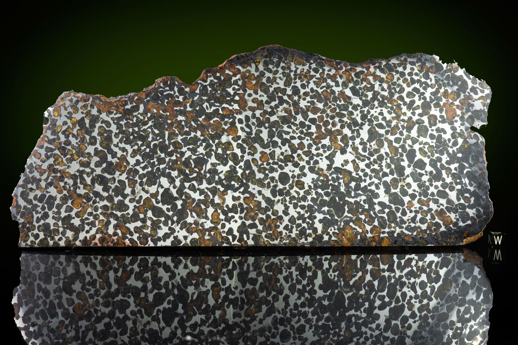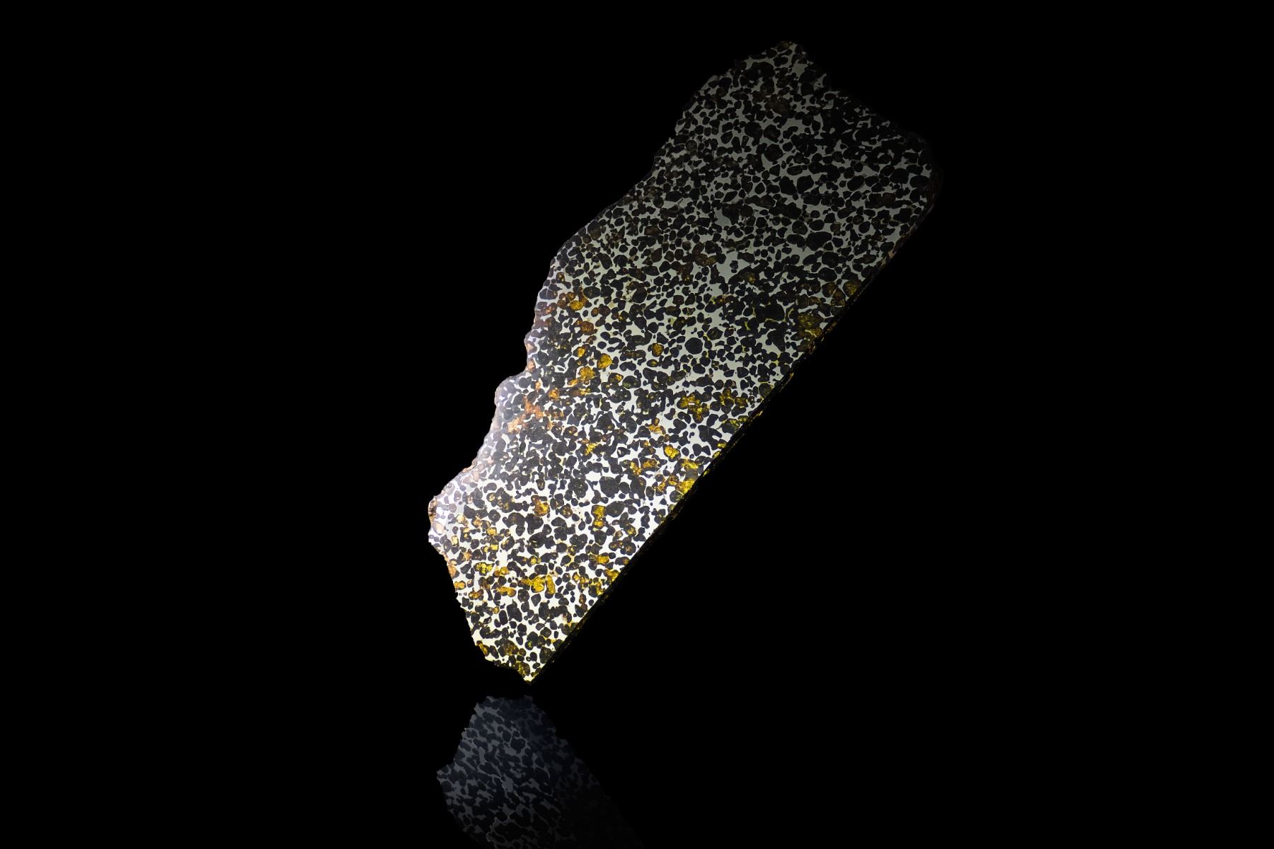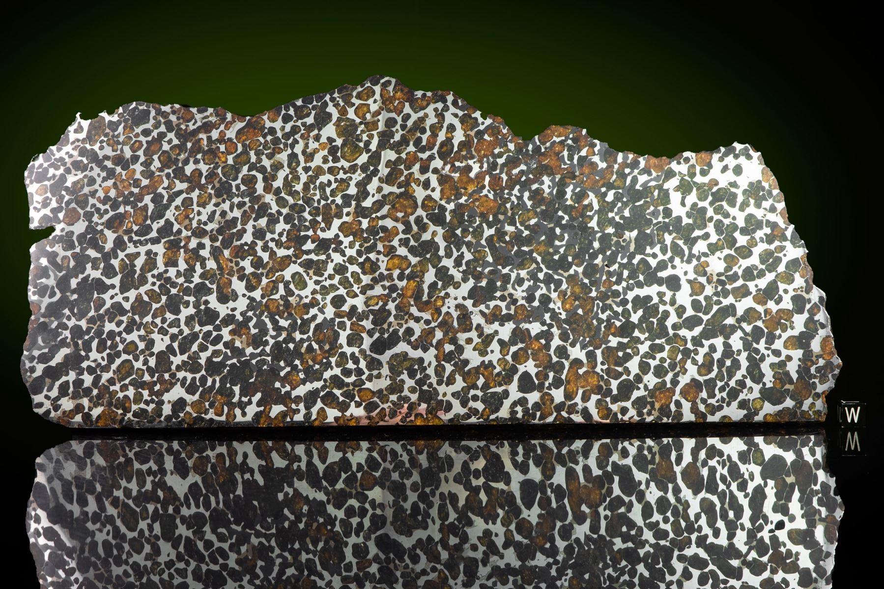 Extraordinary large Sericho pallasite meteorite partial slice, featuring large quantities of olivine crystals on the cut and polished faces. The partial polished and etched slice weighs 1,990 grams and measures approximately 365 mm x 157 mm x 10 mm. Few things create as much excitement in the meteorite world as the discovery of a new pallasite. The Sericho pallasite, found quite recently in Kenya is just such a discovery. Numerous masses of varying size and widely varying degrees of weathering have been recovered. This example come directly from Kenya and the mass from which our slices are taken show minimal weathering, as indicated by the green crystals present in this specimen. This slice has been beautifully prepared by an expert in pallasite cutting and polishing. Olivine crystals account for about 70% of the area of cut faces, and they show slight translucency with an attractive color palette ranging from light green to jade green, orange, and brown. A rare chance to acquire such a stunning pallasite example. Accompanied by a certificate of authenticity signed by Geoff Notkin of Aerolite Meteorites Inc. and the TV show Meteorite Men, as well as a specimen identification card.