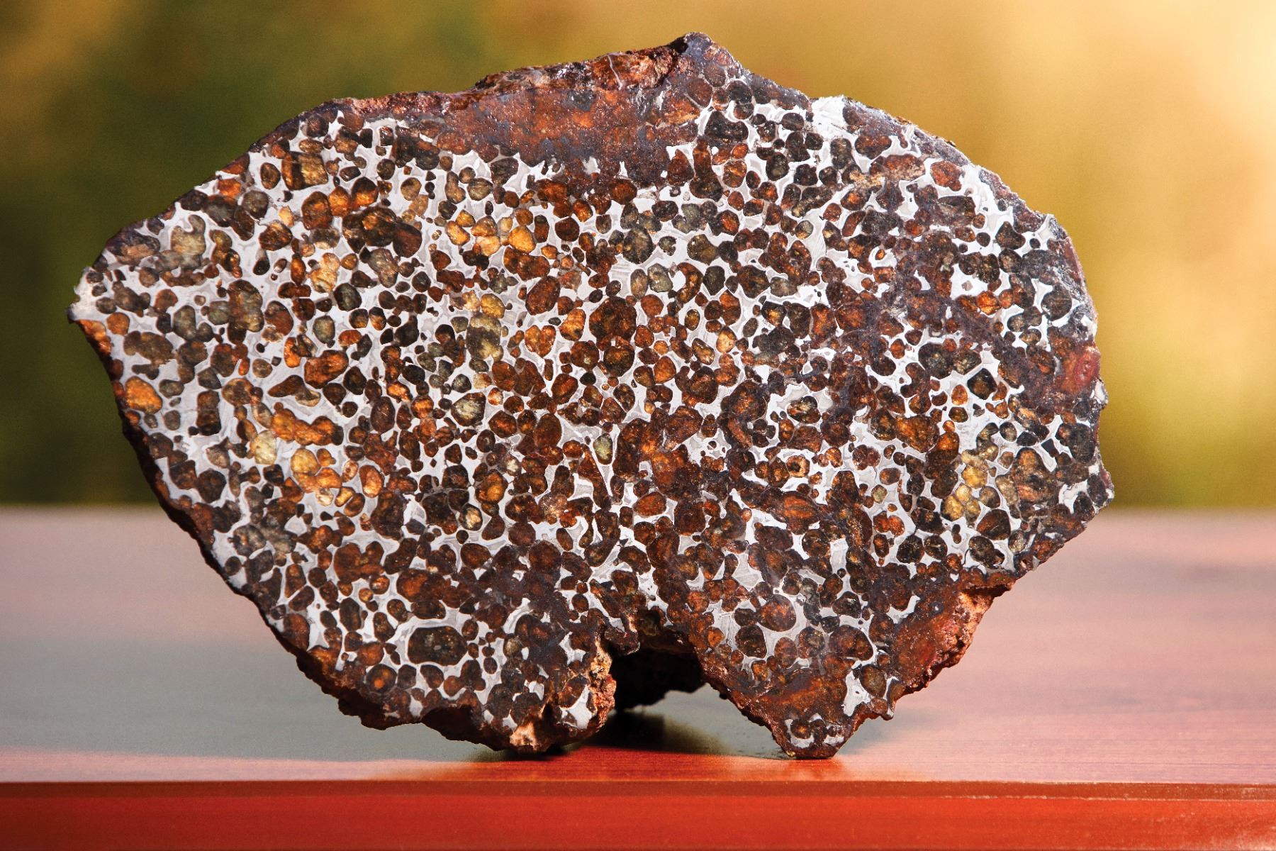 Only a handful of skilled preparators have the expertise to carry out the type of exacting work that can reveal the inner beauty of a pallasite such as this. Sericho’s matrix is very hard—an amalgam of nickel, iron, and trace elements. The diamond-tipped saw employed to slice it must be resilient enough to work its way through such as mass, but also delicate and patient enough not to destroy the comparatively soft crystals within (peridot rates 6.5–7 on the hardness scale). An exquisite meteorite like this, when found, isn’t just dropped off at the local rock shop. After identification (and classification or analysis, if required), it is sent to one of the very few specialists who can handle such work. As such, expert human craft and technique have here added value and beauty to some of the solar system’s finest work.