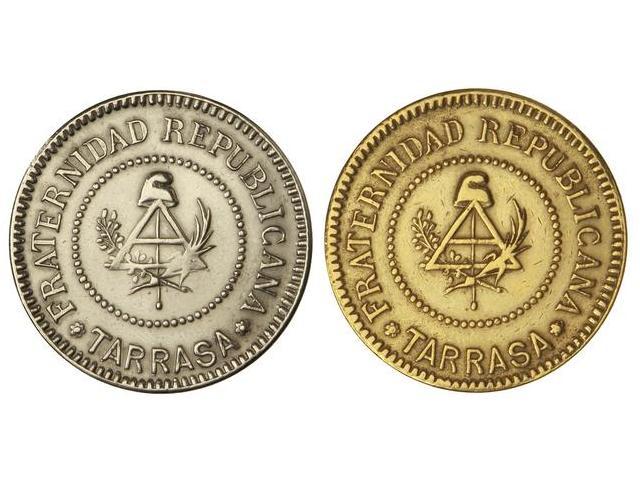 Serie 2 fichas 10 Céntimos y 1 Peseta. - S/F. - FRATERNIDAD REPUBLICANA. TARRASA. - Latón y Ni. (Pequeños golpecitos). ESCASAS. L-154, 155. MBC+. - -