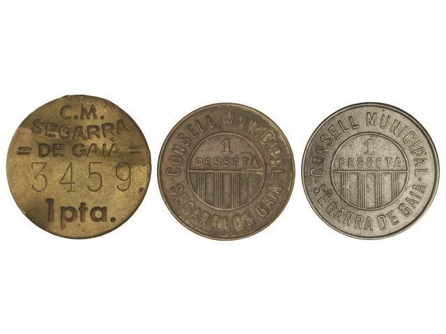Serie 3 monedas 1 Pesseta. S/F. C.M. de SEGARRA DE GAIA. Ni, AE y latón. (La de latón algo alabeada). Vti-L41/43. MBC a MBC+.