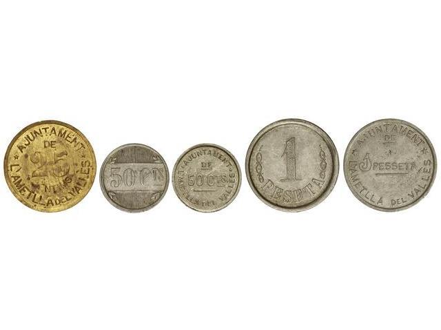 Serie 5 monedas 25, 50 Cèntims (2) y 1 Pesseta (2). Aj. de l´AMETLLA DEL VALLÈS. Al (4) y latón. RARAS. AT-143/147; T-199/203; Vti-L13/L17. MBC+ a EBC.