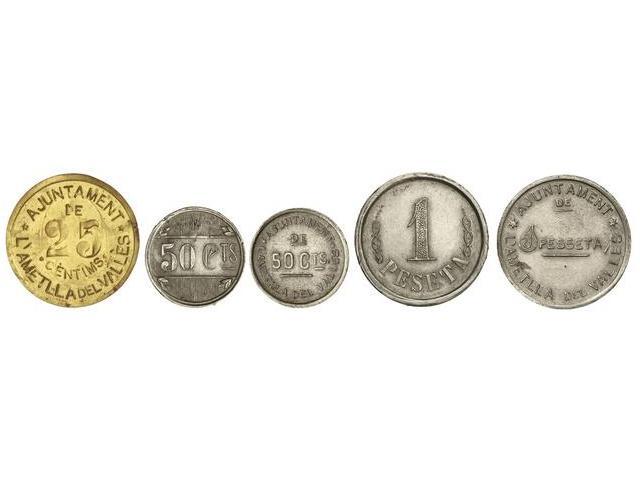 Serie 5 monedas 25 y 50 Céntimos (2) y 1 Pesseta (2). Aj. de l´AMETLLA DEL VALLÈS. Al (4) y latón. Vti- AT-143/147; T-199/203; L13/L17. MBC+ a EBC-.