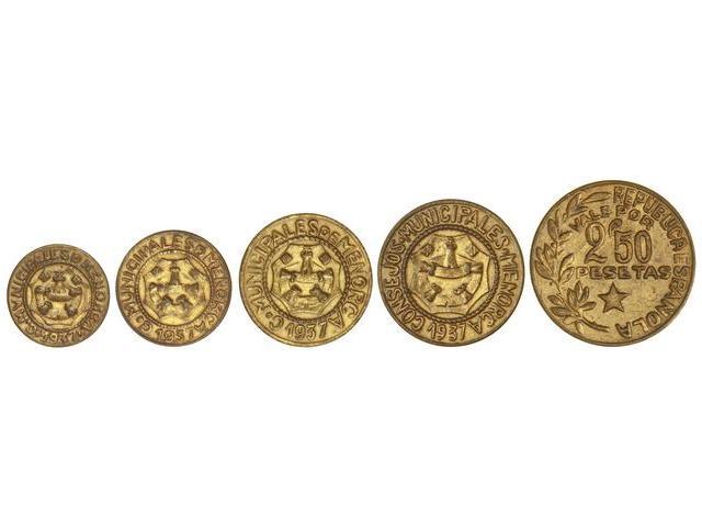 Serie 5 monedas 5 Céntimos a 2,50 Pesetas. - C.M. de MENORCA - . Latón. (Barnizadas). EBC+. - -