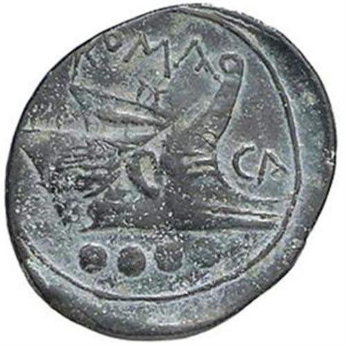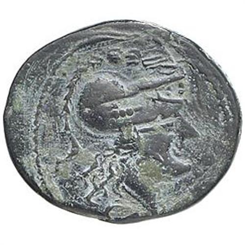 Repubblica Romana. Serie CA. Triente, 209-208 a.C. Canusium. D/ Testa elmata di Minerva a destra. Sopra, quattro globetti. R/ Prua a destra. Sopra, ROMA. Davanti, CA. Sotto, quattro globetti. Cr. 100/3. gr. 4.79 AE. Bel BB/BB+. Ribattuta su moneta non identificata.