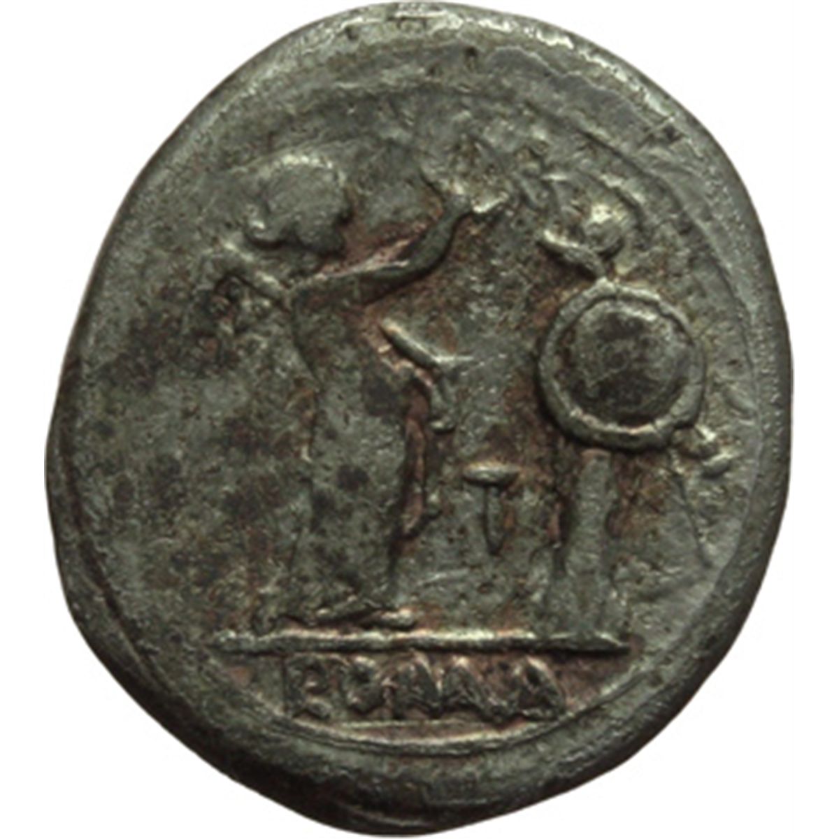 Repubblica Romana. Serie L/T. Vittoriato, 211-210 a.C. D/ Testa laureata di Jupiter a destra. Sotto, L. R/ Vittoria stante a destra incorona un trofeo. Nel campo, T. In esergo: ROMA. Cr.98A/1a. AG. g. 3.10 mm. 17.50 R. BB.