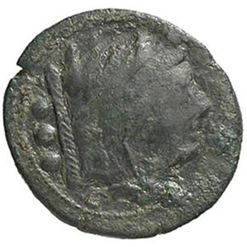 Serie 'spiga'. Quadrante, 214-212 a.C. Sicilia. D/ Testa di Ercole a destra. Dietro, tre globetti. R/ Toro che carica a destra. Sopra, spiga di grano e tre globetti. Sotto, serpente. In esergo: ROMA. Cr. 42/2. gr. 12.23 R. AE. BB.