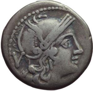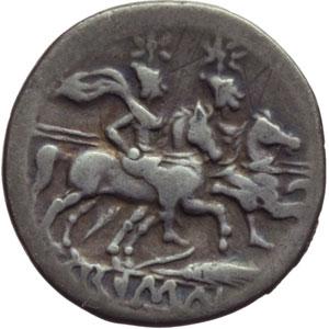 Repubblica Romana. Serie 'spiga'. Quinario, 211-210 a.C. D/ Testa di Roma a destra. Dietro, V. R/ I Dioscuri al galoppo a destra. Sotto i cavalli, spiga. In esergo: ROMA. Cr. 72/4. AG. g. 2.08 mm. 15.00 BB.