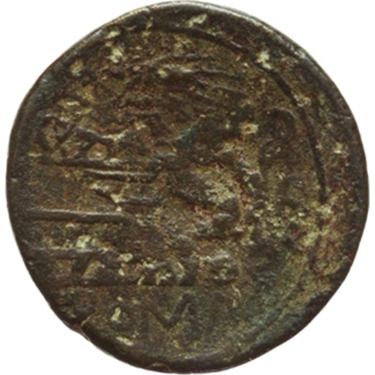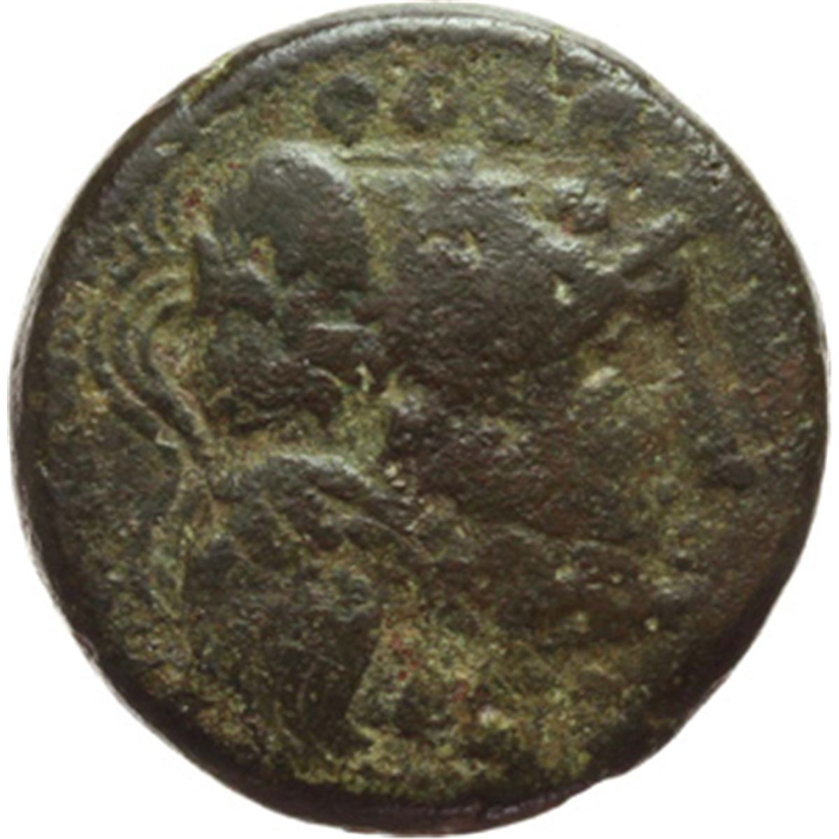 Repubblica Romana. Serie 'spiga'. Triente, 211-210 a.C. Sicilia. Ribattuto su AE 22 di Siracusa, Apollo/Dioscuri, del 214-212 a.C. (SNG ANS 1054). D/ Testa di Minerva a destra. Sopra, quattro globetti. R/ Prua a destra. Sopra, spiga. Davanti, quattro globetti. Sotto, ROMA. Cr.72/13. AE. g. 11.27 mm. 23.50 RR. Molto raro e interessante. qBB.