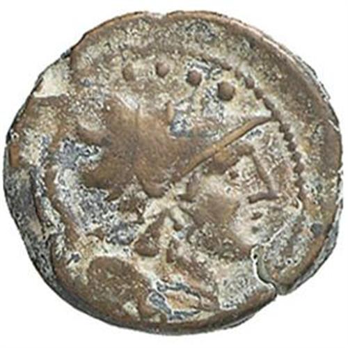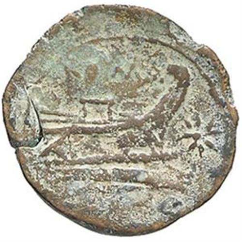 Serie 'stella'. Triente, 169-158 a.C. D/ Testa elmata di Minerva a destra. Sopra, quattro globetti. R/ Prua a destra. Sopra, ROMA. Davanti, stella. Sotto, quattro globetti. Cr. 196/3. gr. 7.56 R. AE. BB+/BB. 4 esemplari nel Medagliere di Parigi.