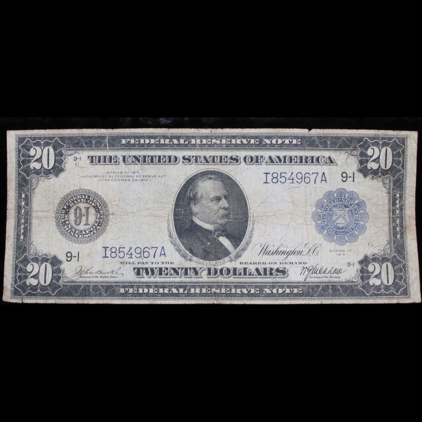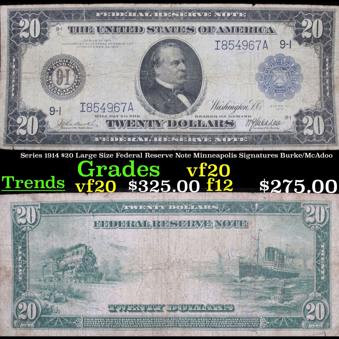 Series 1914 $20 Large Size Federal Reserve Note Minneapolis Signatures Burke/McAdoo Grades vf, very fine. This large-size Federal Reserve Note features Grover Cleveland's portrait on the face. Vignette on the back titled Land, Sea and Air depicts modes of transportation. With blue seal and serial numbers. Signatures Burke/McAdoo And Issues From The Bank of Minneapolis