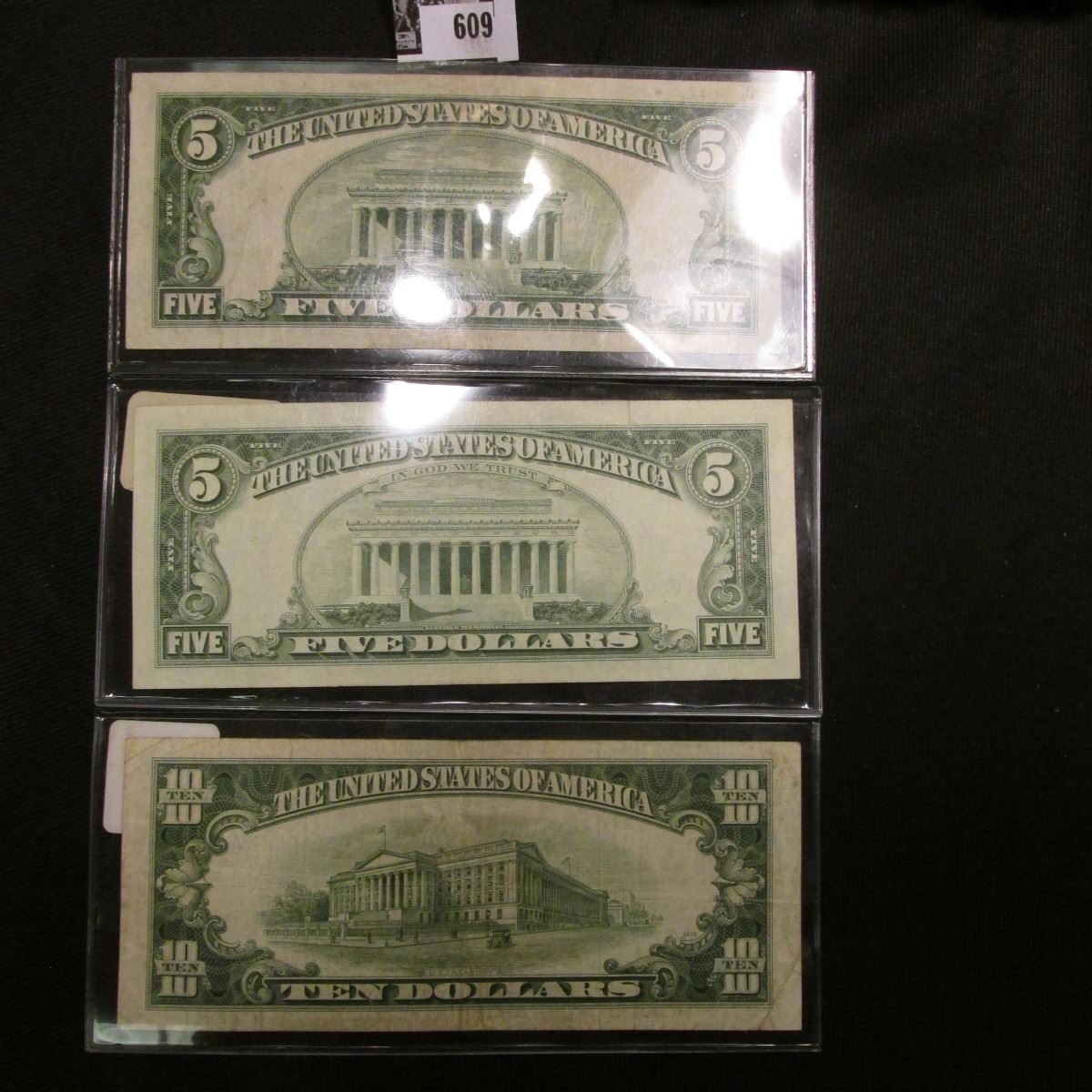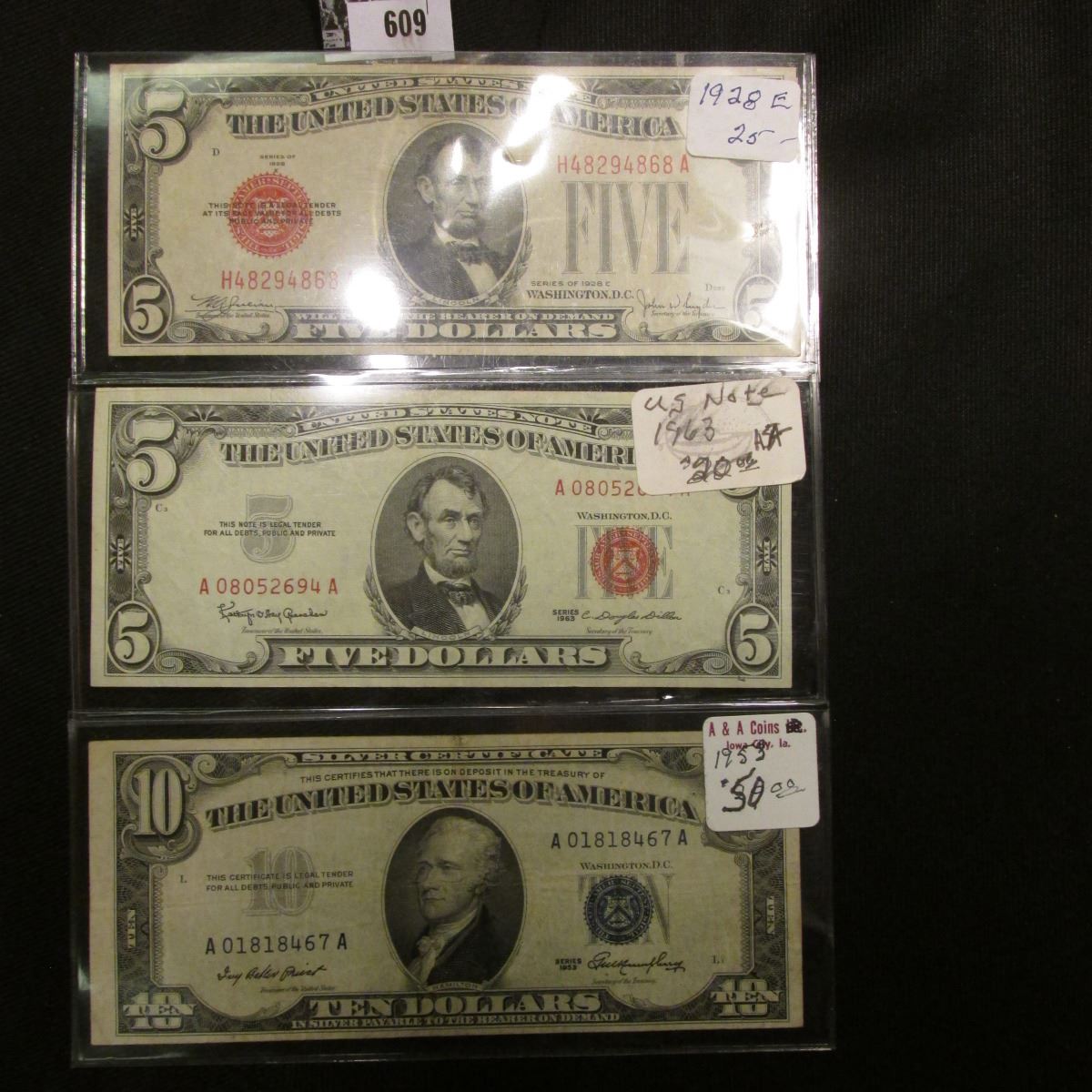 Series 1928E Five Dollar U.S. Note with 'Red Seal', Fine; Series 1963 Five Dollar U.S. Note with 'Red Seal', Extra Fine; & Series 1953 $10 United States Silver Certificate, VF.