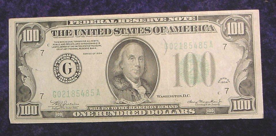 Series 1934 $100 Federal Reserve Note. VF-EF.