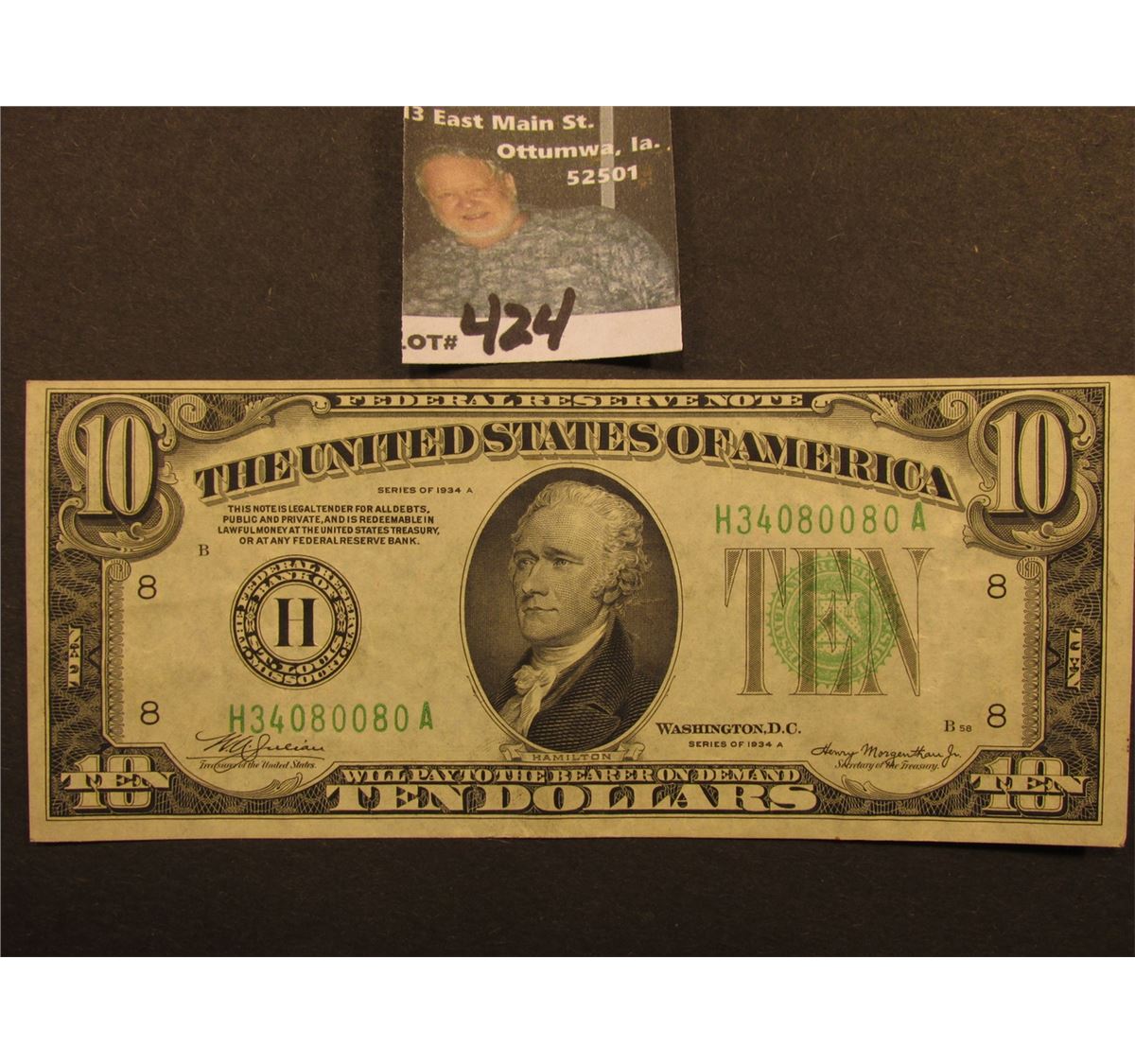 Series 1934 A $10 Federal Reserve Note, obverse Macro B58, reverse Macro 808, EF.