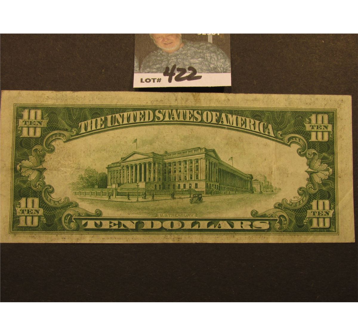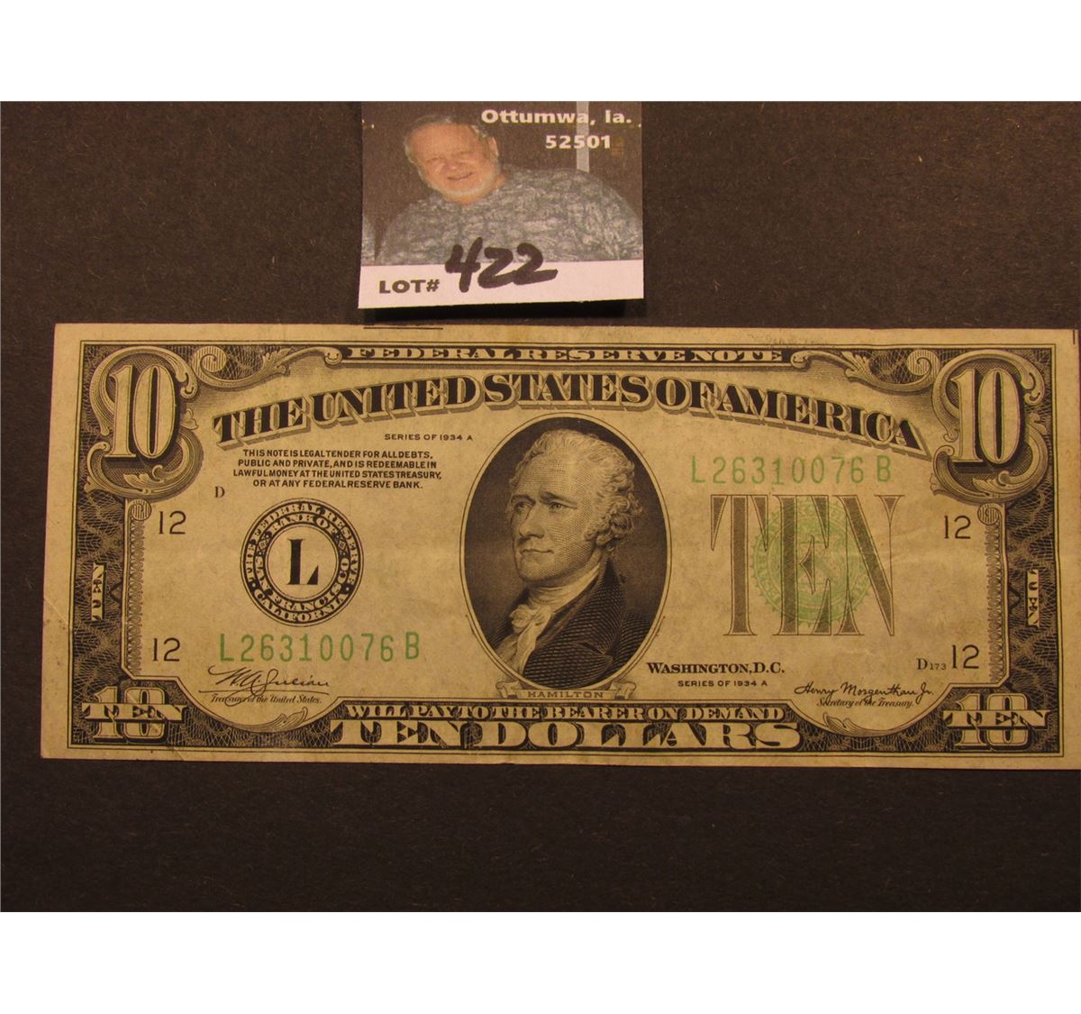 Series 1934 A $10 Federal Reserve Note, obverse Macro D173, reverse Macro 972, VF.
