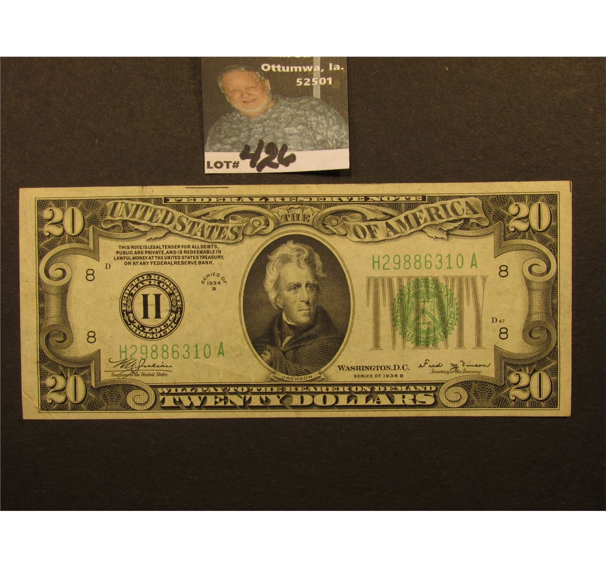 Series 1934 B $20 Federal Reserve Note, obverse Macro D47, reverse Macro 398, AU.
