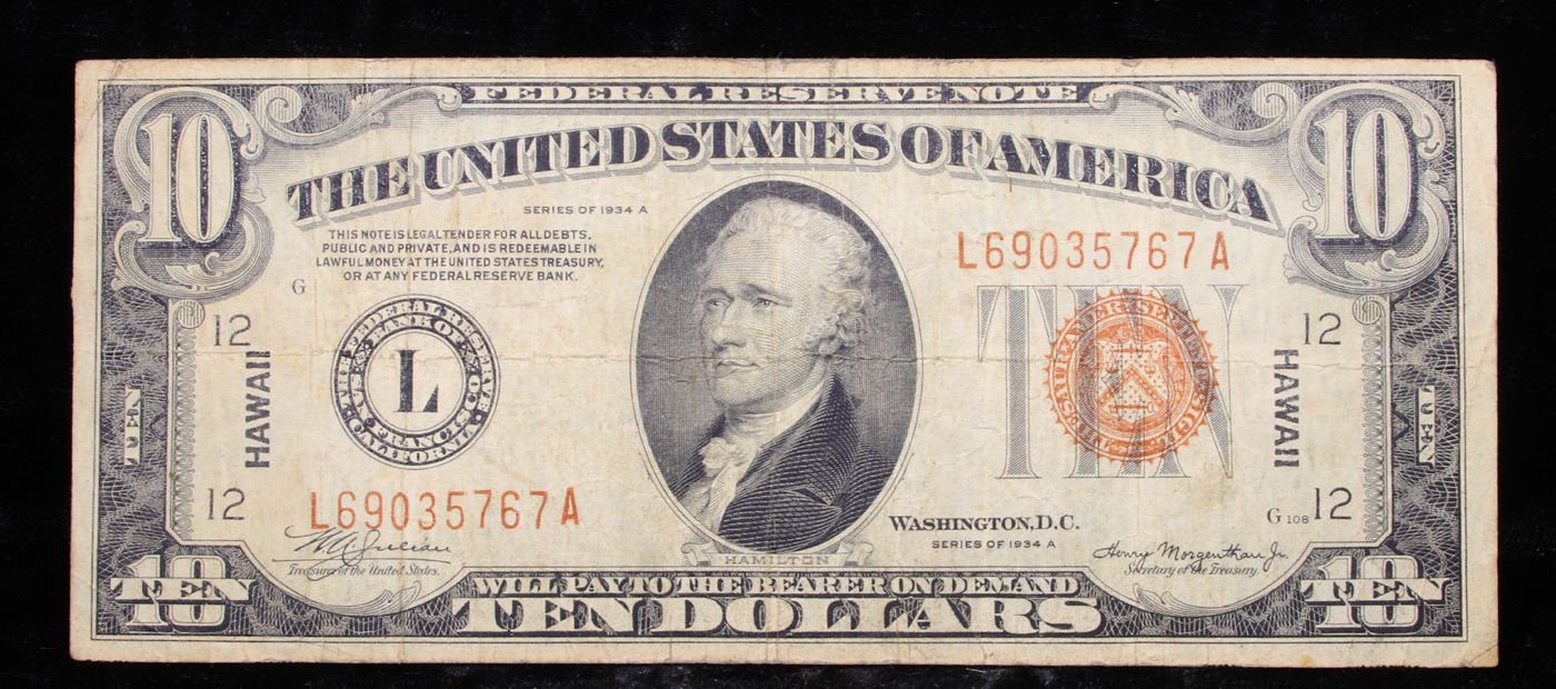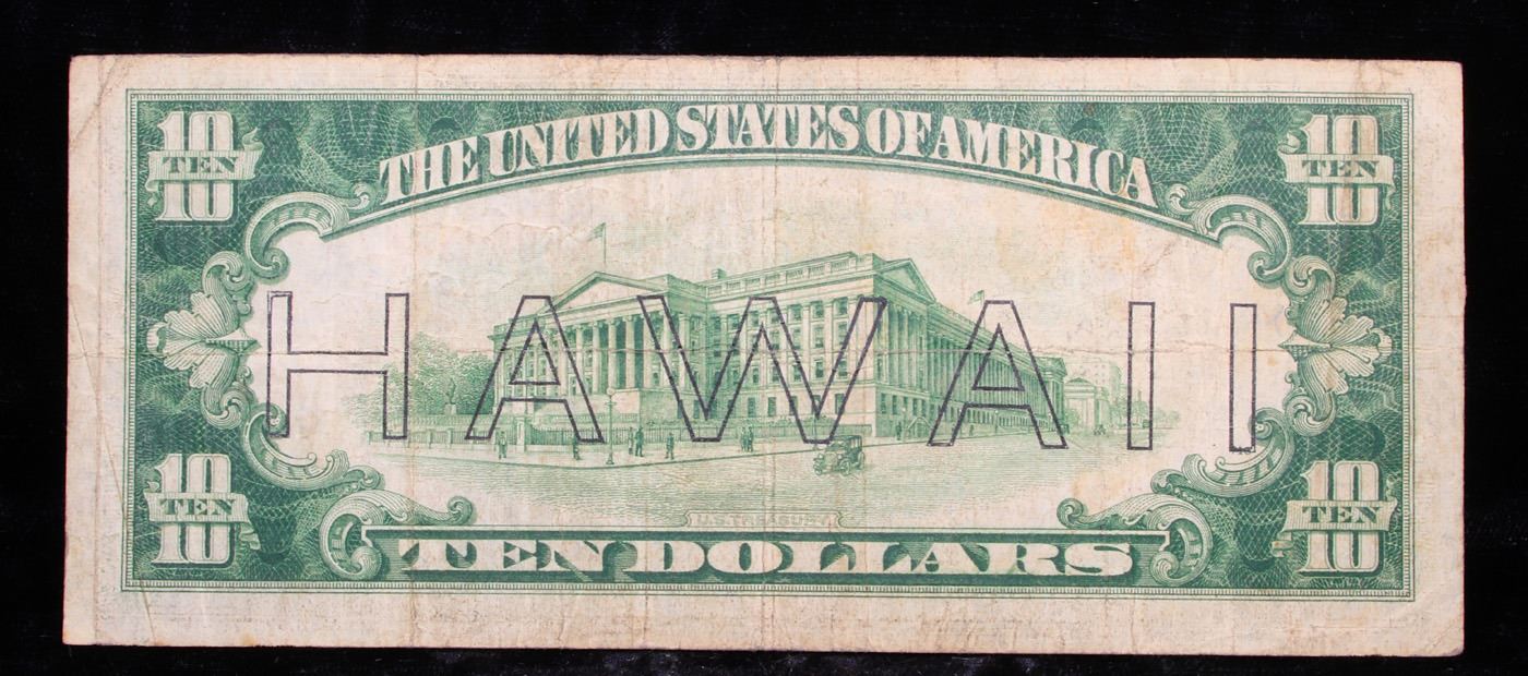 Series 1934A $10 Federal Reserve Note WWII Emergency Currency Hawaii vf++. Out of about 65 Million Hawaii Notes Printed in all Denominations Only about 8% of them were $10 that makes the $10 Hawaii The Second lowest Mintaged Hawaii In the series. $10 Silver Certificate Hawaii, Signatures of Julian & Morgenthau. It was the darkest days of World War II, just after Pearl Harbor. Everybody in Hawaii was sitting on pins and needles. Were the Japanese preparing a massive invasion of the islands? If they did invade, they could use the millions of dollars in currency on the islands to buy war material. To thwart this, these $10 Federal Reserve Notes were sent to the islands. Each has a large HAWAII printed on the reverse. If the Japanese did invade, the currency would be demonetized. After the threat passed, most of these "Hawaii" Notes were destroyed. Today they're hard to find.