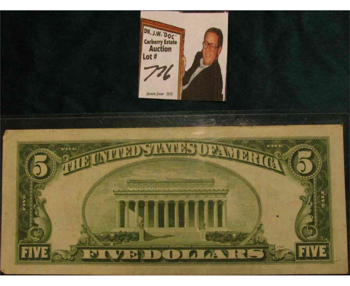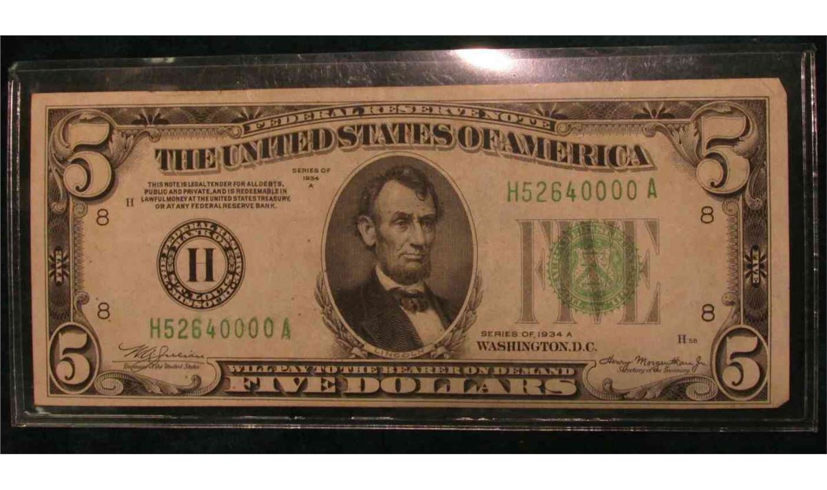 Series 1934A $5 Federal Reserve Note, AU. Obv. Macro plate H58, rev. 1707.