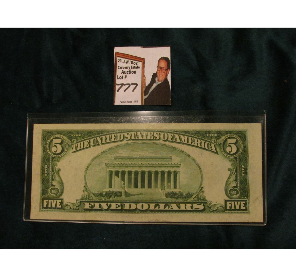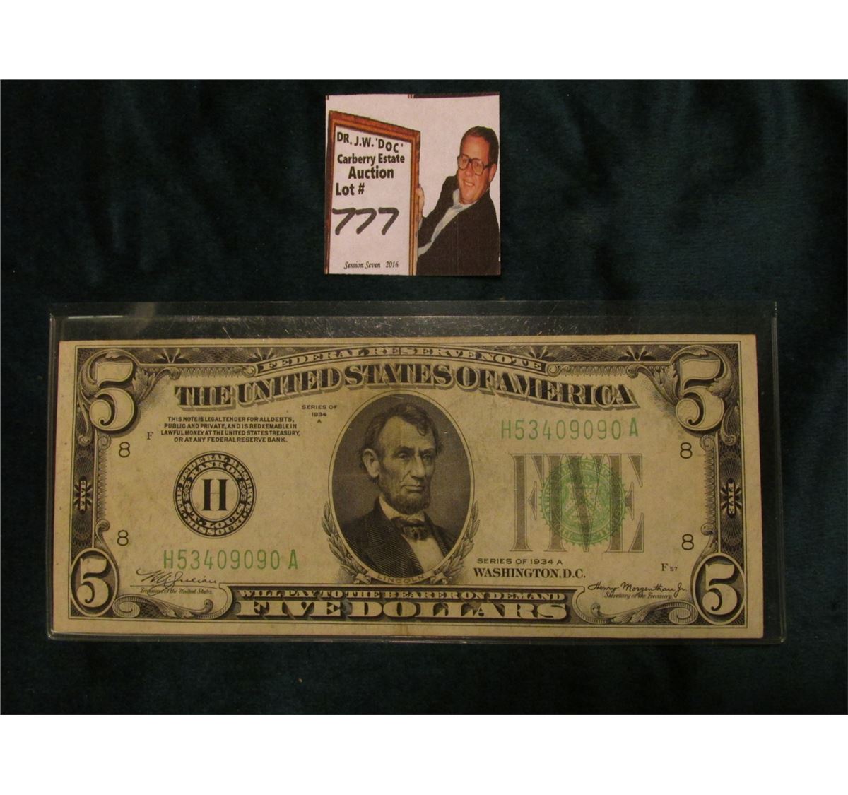 Series 1934A $5 Federal Reserve Note, Fine. Obv. Macro plate F57, rev. 1712.