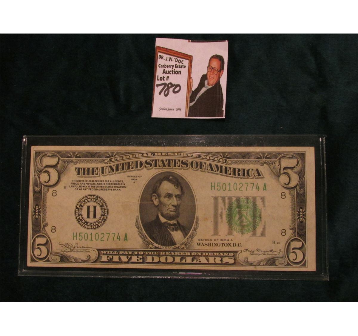 Series 1934A $5 Federal Reserve Note, VF+. Obv. Macro plate H46, rev. 1640.