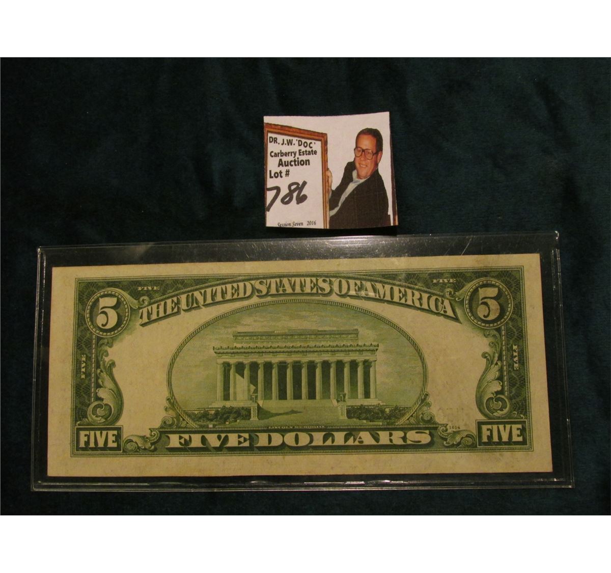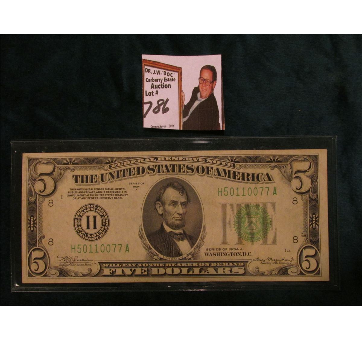 Series 1934A $5 Federal Reserve Note, VF+. Obv. Macro plate I48, rev. 1614.