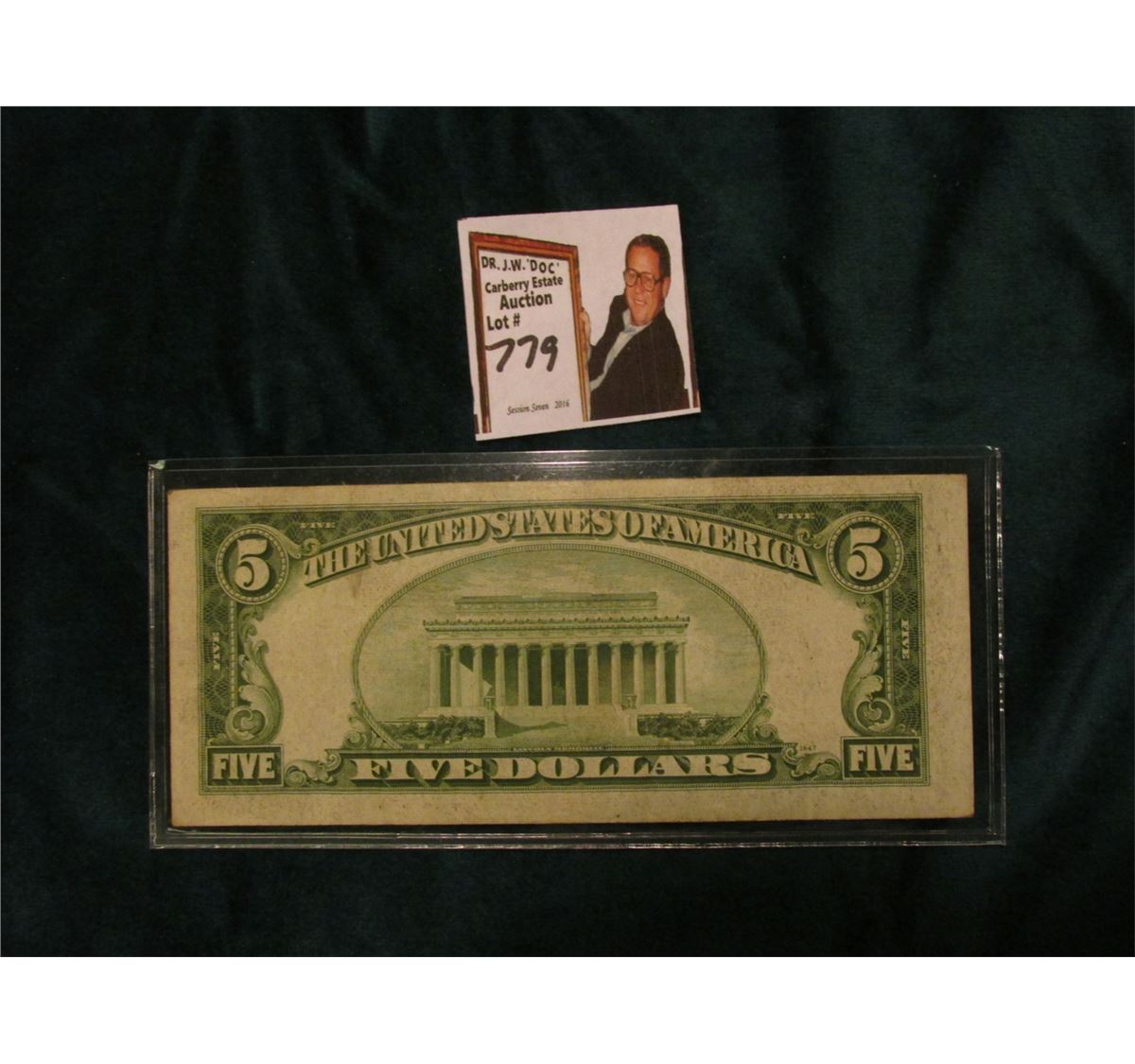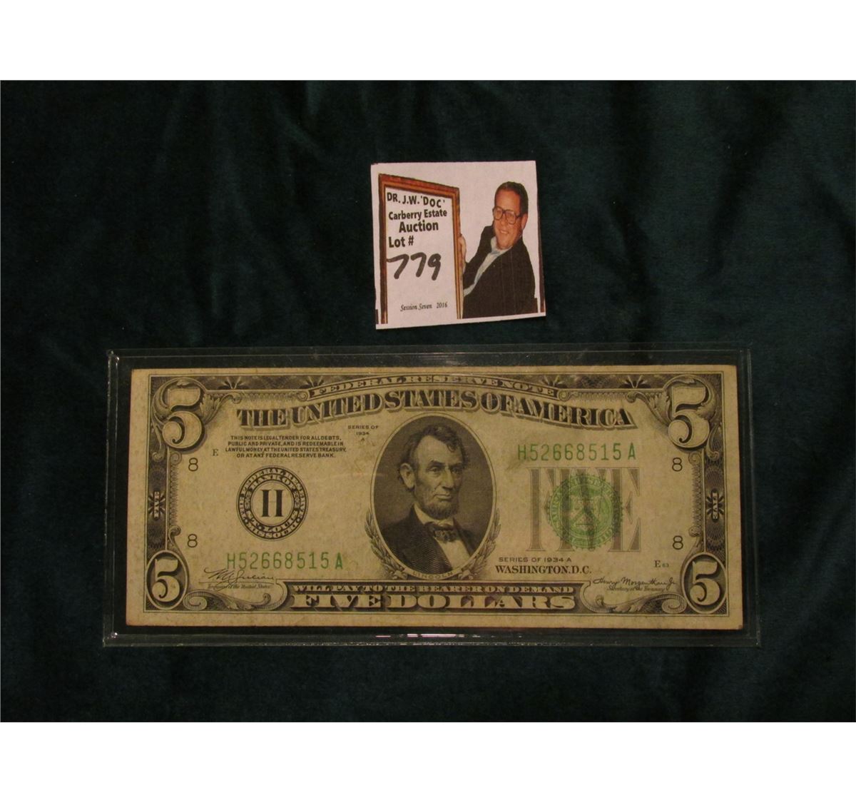 Series 1934A $5 Federal Reserve Note, Very Fine. Obv. Macro plate E63, rev. 1647.