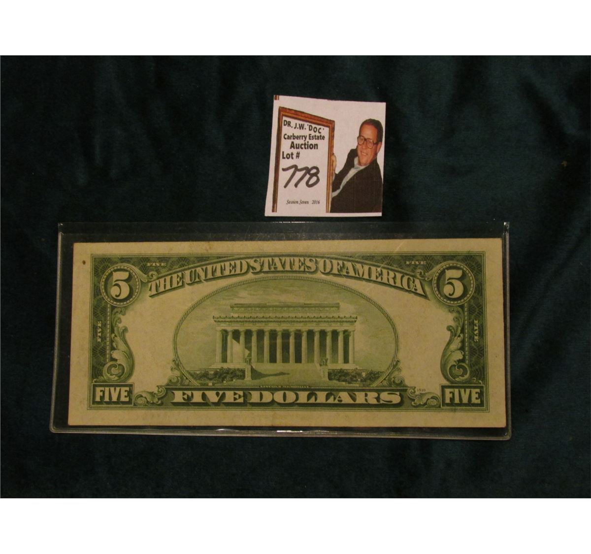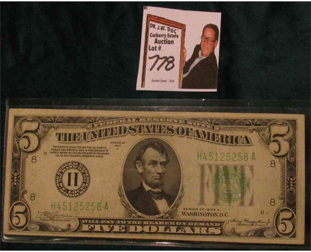 Series 1934A $5 Federal Reserve Note, Very Fine. Obv. Macro plate H47, rev. 1510.