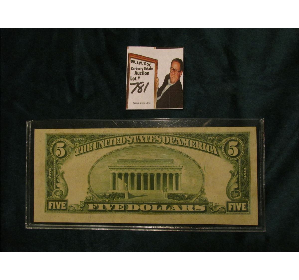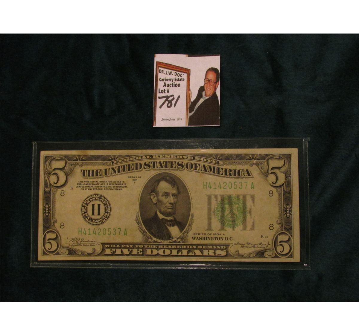 Series 1934A $5 Federal Reserve Note, Very Fine. Obv. Macro plate K48, rev. 1483.
