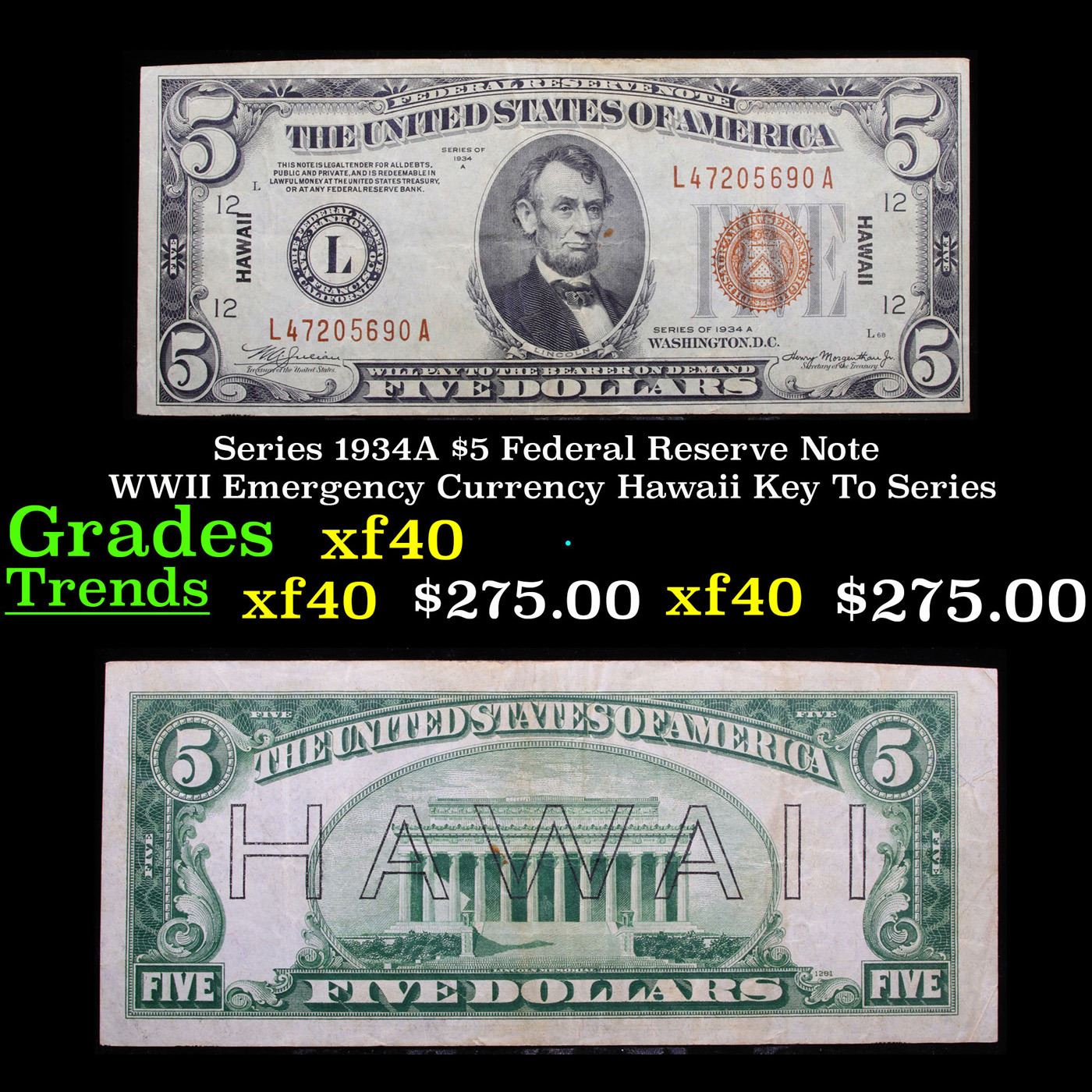 Series 1934A $5 Federal Reserve Note WWII Emergency Currency Hawaii Key To Series Grades xf