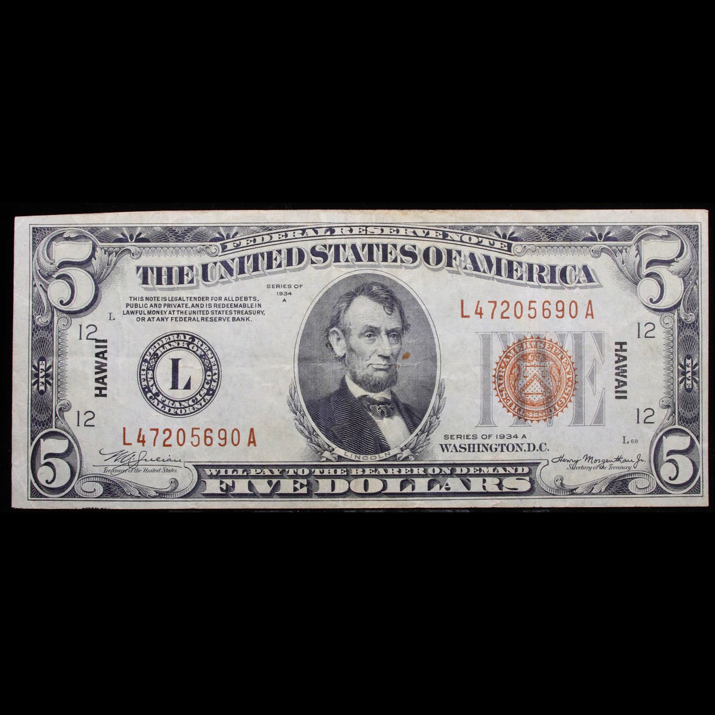 Series 1934A $5 Federal Reserve Note WWII Emergency Currency Hawaii Key To Series Grades xf. Out of about 65 Million Hawaii Notes Printed in all Denominations Only about 7% of them were $5 that makes the $5 Hawaii The lowest Mintaged Hawaii In the series and makes it the key date for the series.1934a $5 Silver Certificate Hawaii, Signatures of Julian & Morgenthau. It was the darkest days of World War II, just after Pearl Harbor. Everybody in Hawaii was sitting on pins and needles. Were the Japanese preparing a massive invasion of the islands? If they did invade, they could use the millions of dollars in currency on the islands to buy war material. To thwart this, these $5 Federal Reserve Notes were sent to the islands. Each has a large HAWAII printed on the reverse. If the Japanese did invade, the currency would be demonetized. After the threat passed, most of these "Hawaii" Notes were destroyed. Today they're hard to find.